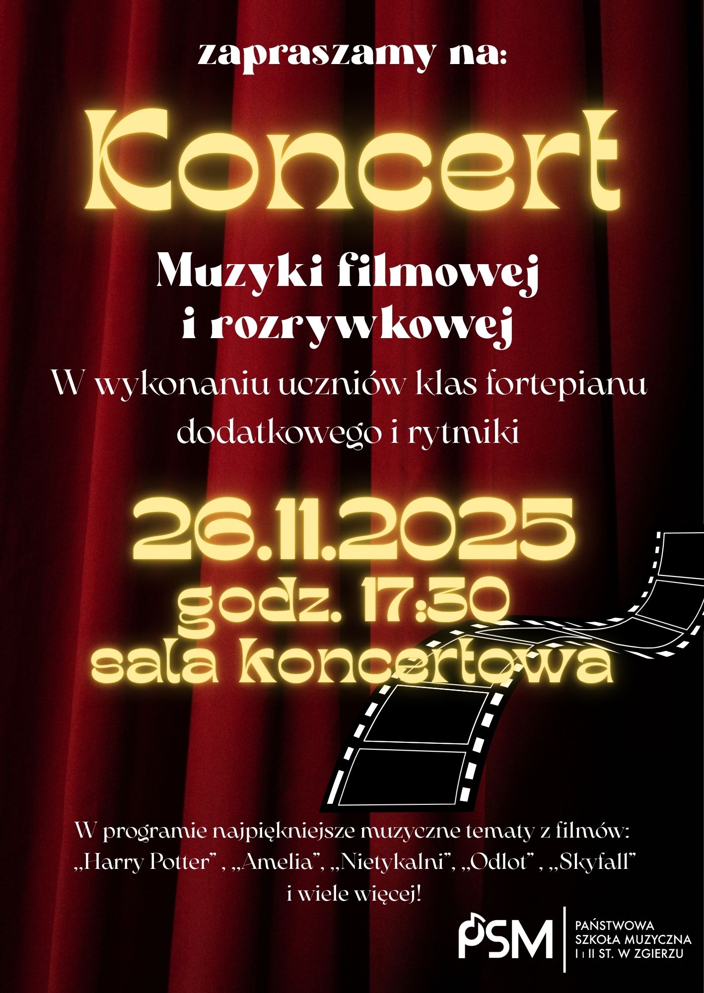 Zapraszamy na Koncert muzyki filmowej i rozrywkowej w wykonaniu klas fortepianu dodatkowego i rytmiki.