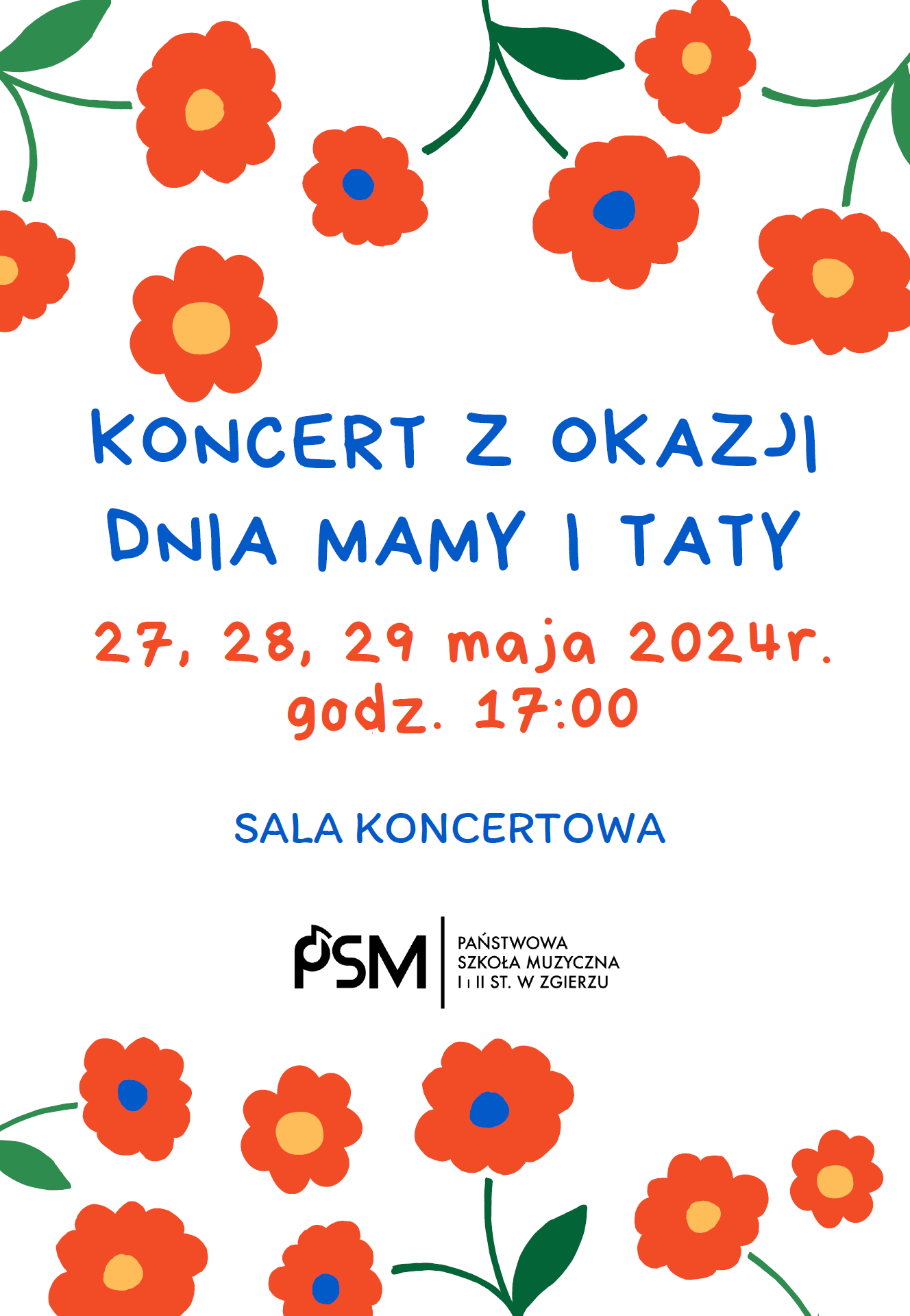 W dniach 27, 28, 29 maja 2024 r. o godzinie 17:00 w Sali Koncertowej PSM I i II st. odbędą się koncerty z okazji Dnia Mamy i Taty.