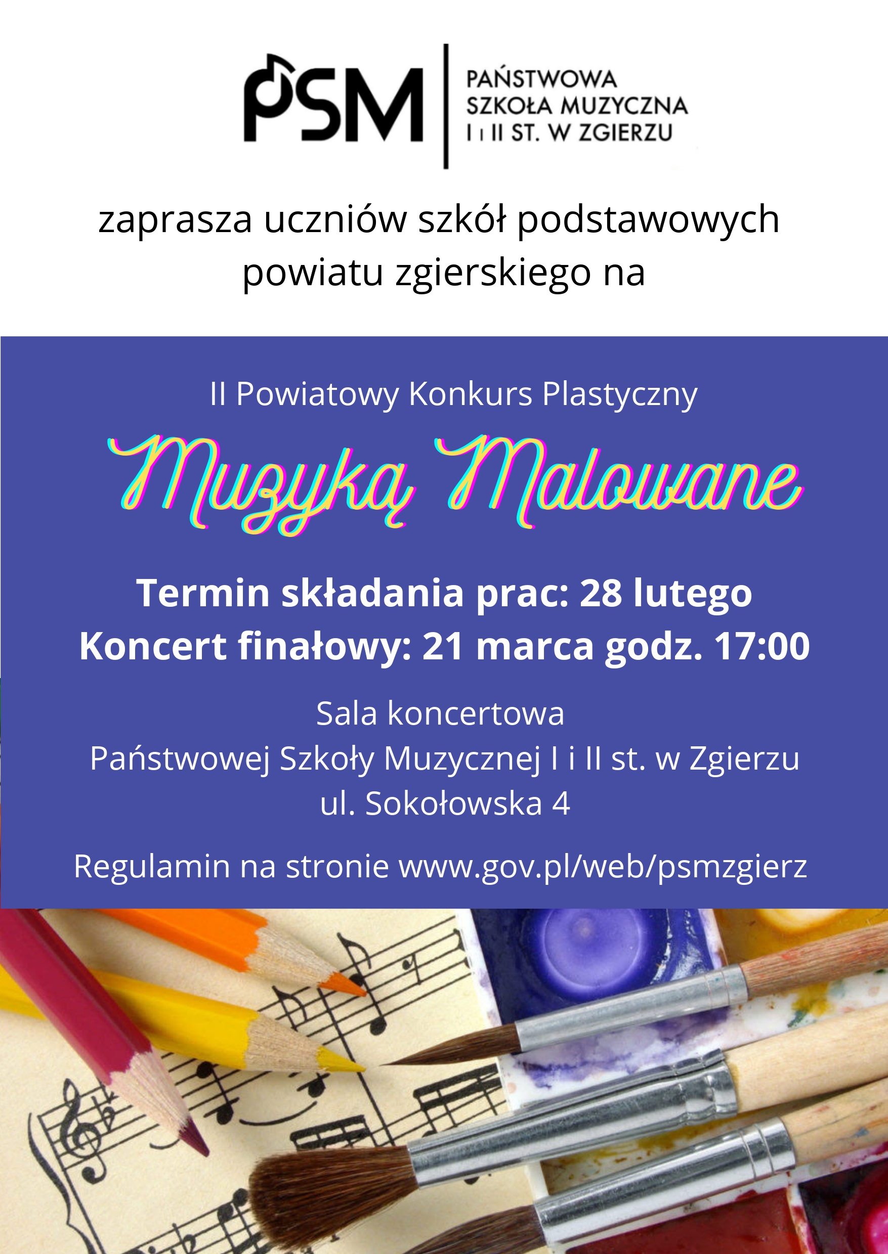 Państwowa Szkoła Muzyczna I i II st. W Zgierzu zaprasza uczniów szkół podstawowych powiatu zgierskiego do udziału w II Konkursie Plastycznym „Muzyką malowane”.