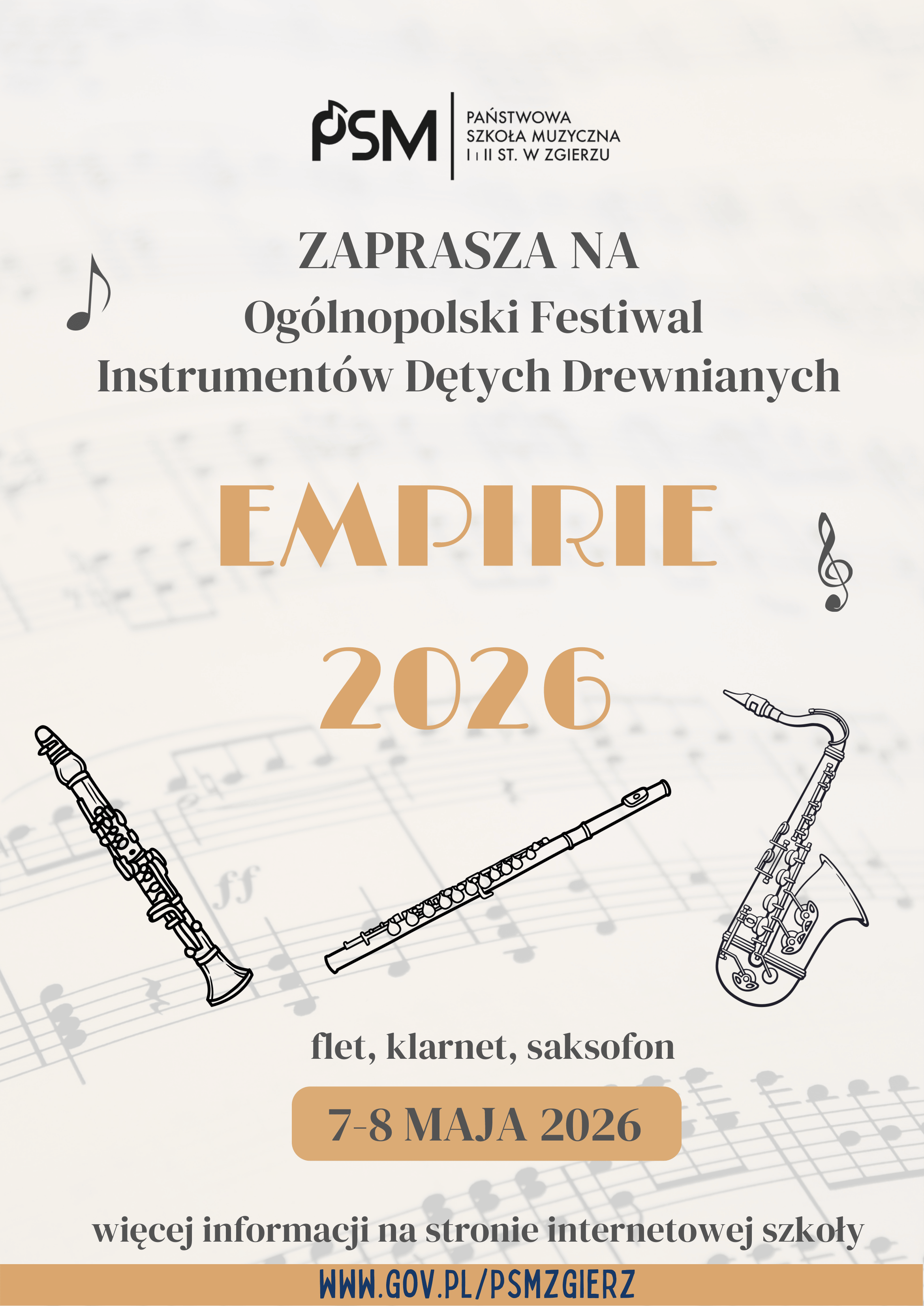 Z ogromną radością pragniemy zaprosić wszystkich miłośników muzyki, artystów oraz pasjonatów instrumentów dętych drewnianych na Ogólnopolski Festiwal Instrumentów Dętych Drewnianych EMPIRIE 2026, który odbędzie się w dniach 7-8 maja 2026 roku w Państwowej Szkole Muzycznej I i II stopnia w Zgierzu.