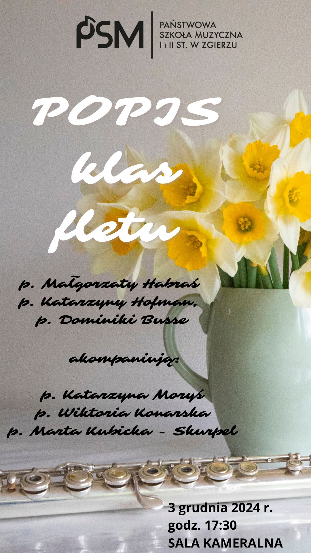 Zapraszamy na popis klas fletu p. Małgorzaty Habraś, p. Katarzyny Hofman oraz p. Dominiki Busse przy akompaniamencie p. Katarzyny Moryś, p. Wiktorii Konarskiej i p. Marty Kubickiej-Skurpel.