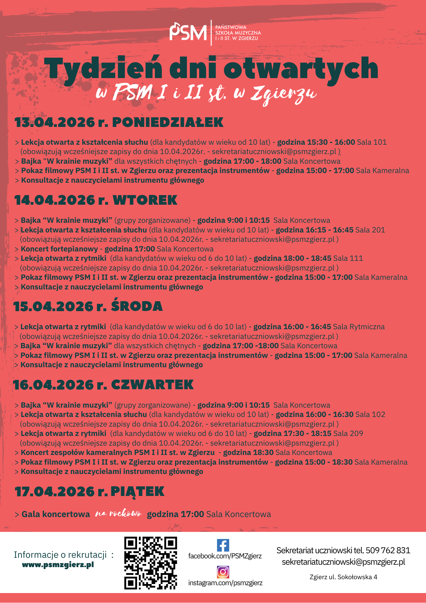 - Lekcja otwarta z kształcenia słuchu (dla kandydatów w wieku od 10 lat) – godzina 15:30–16:00, Sala 101 (obowiązują wcześniejsze zapisy do dnia 10.04.2026 r. – sekretariatuczniowski@psmzgierz.pl