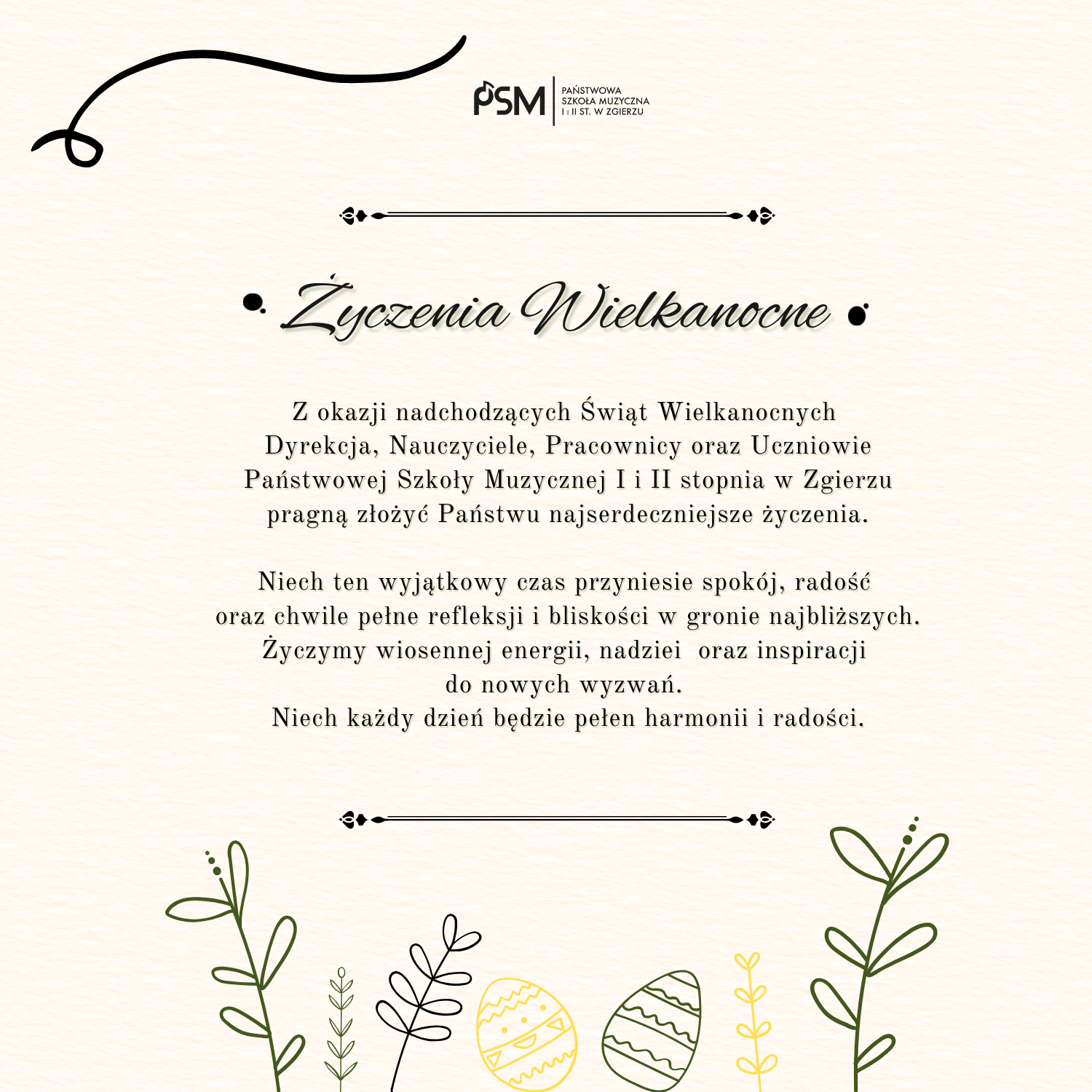 Z okazji nadchodzących Świąt Wielkanocnych Dyrekcja, Nauczyciele, Pracownicy oraz Uczniowie Państwowej Szkoły Muzycznej I i II stopnia w Zgierzu pragną złożyć Państwu najserdeczniejsze życzenia.
