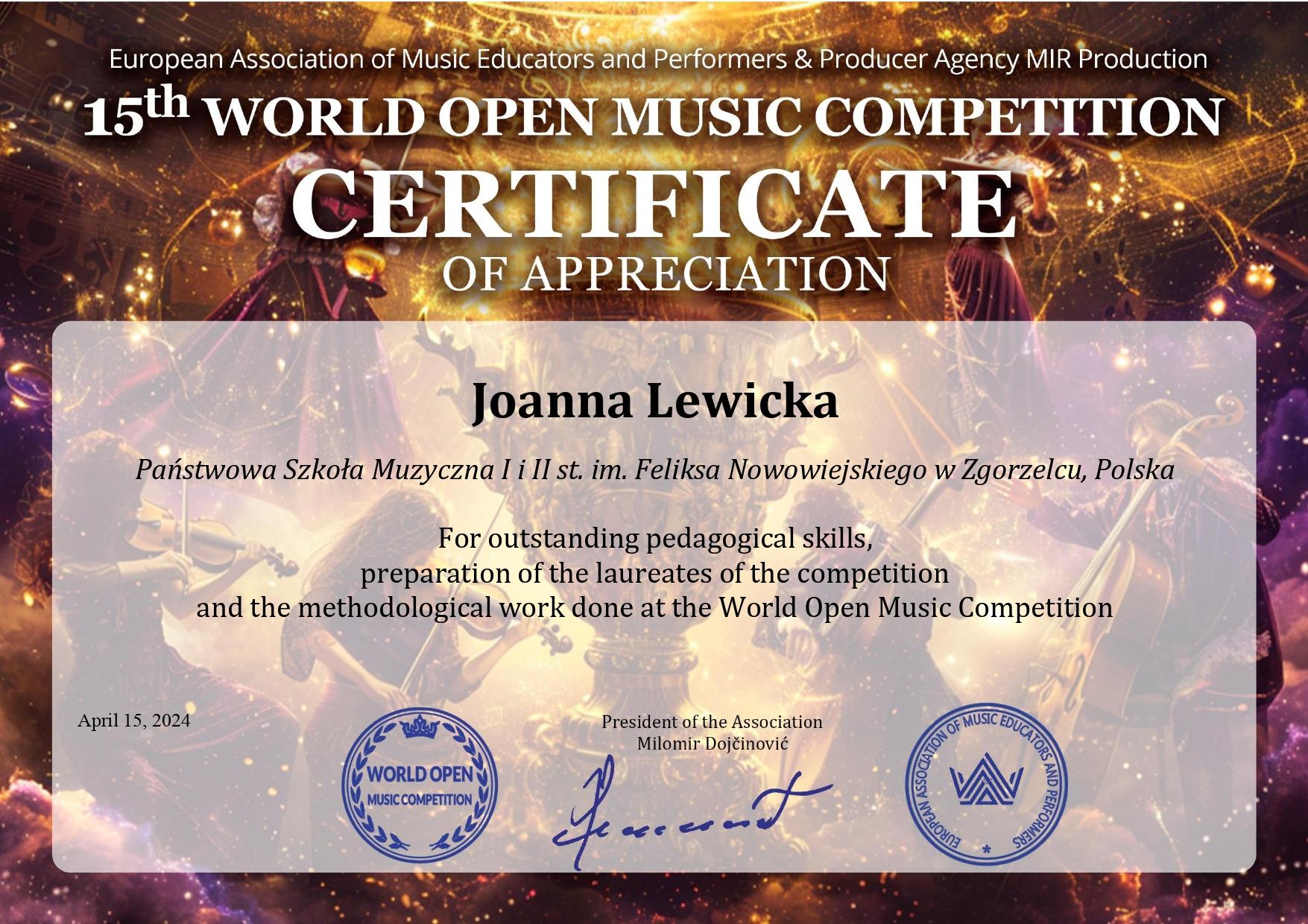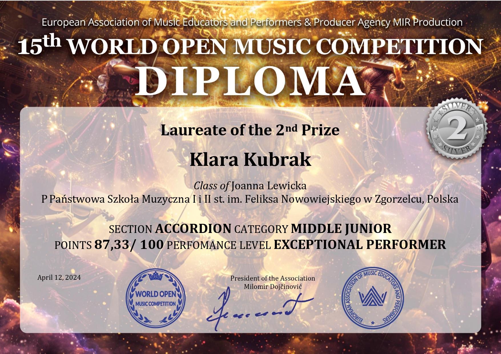 Klara Kubrak, uczennica klasy V cyklu 6-letniego oraz Lilia Ostrowska, uczennica klasy II cyklu 6-letniego zdobyły II miejsce w swoich kategoriach wiekowych podczas World Open Online Music Competition. World Open Online Music Competition jest najstarszym konkursem o zasięgu międzynarodowym, który od początku swojego istnienia odbywa się w całości w formule online. Młode akordeonistki ze zgorzeleckiej szkoły muzycznej oceniało jury, w skład którego wchodzą profesorowie z Wietnamu, Czech, Serbii oraz Polski. Dziewczęta gry na akordeonie uczą się w klasie Joanny Lewickiej. Gratulujemy i życzymy kolejnych sukcesów!