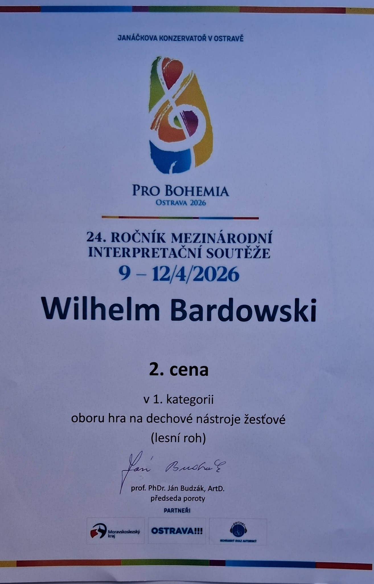 Z ogromną dumą i radością składamy serdeczne gratulacje dla Wilhelma Bardowskiego z okazji zdobycia 2. miejsca podczas 24. International Competition Pro Bohemia Ostrava 2026. To wyjątkowe osiągnięcie stanowi dowód nie tylko wybitnego talentu, lecz także systematycznej pracy, determinacji i pasji do muzyki.