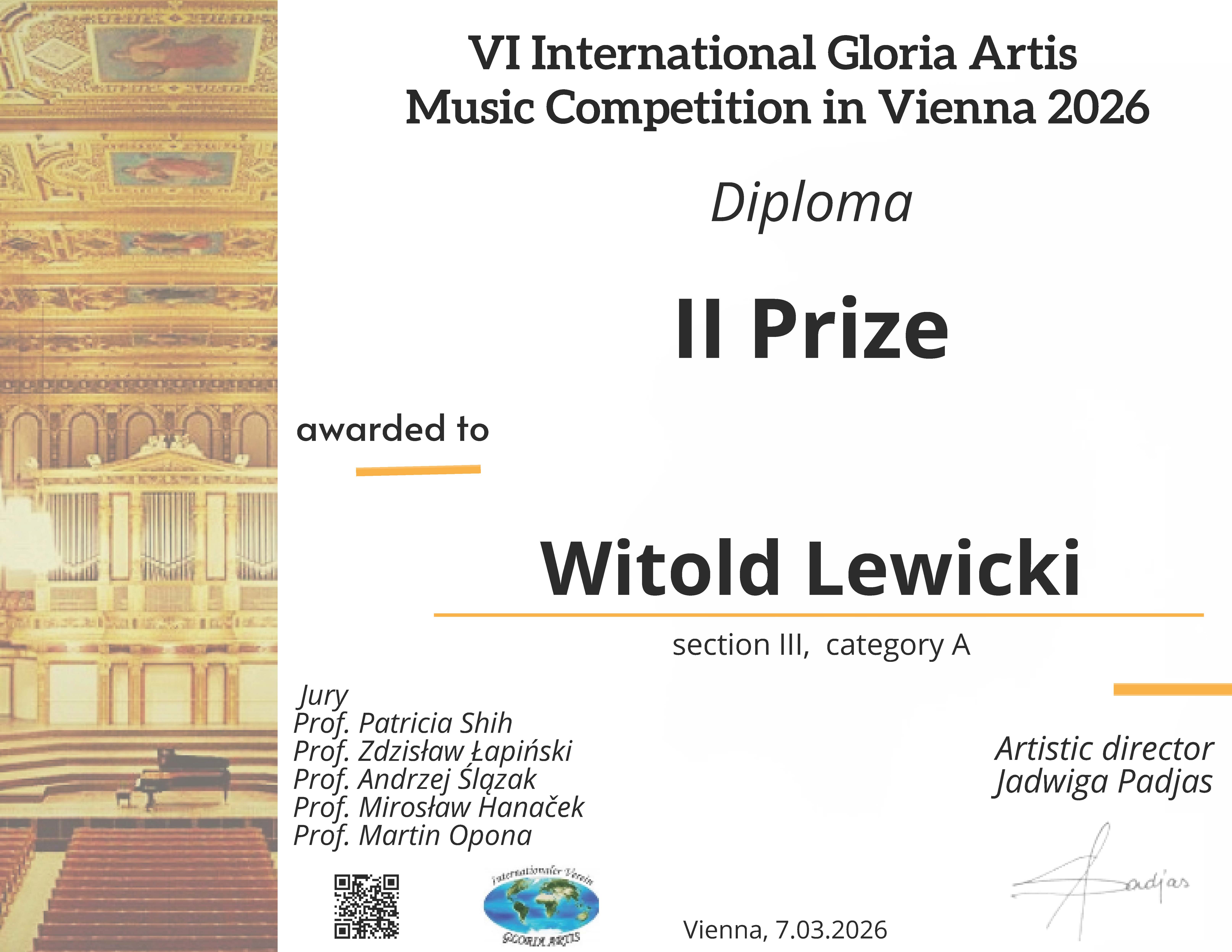 Spieszymy donieść, że uczeń z klasy wiolonczeli - Witold Lewicki ponownie znalazł się na podium - zdobył II miejsce w VI Międzynarodowym Konkursie Muzycznym Gloria Artis w Wiedniu.