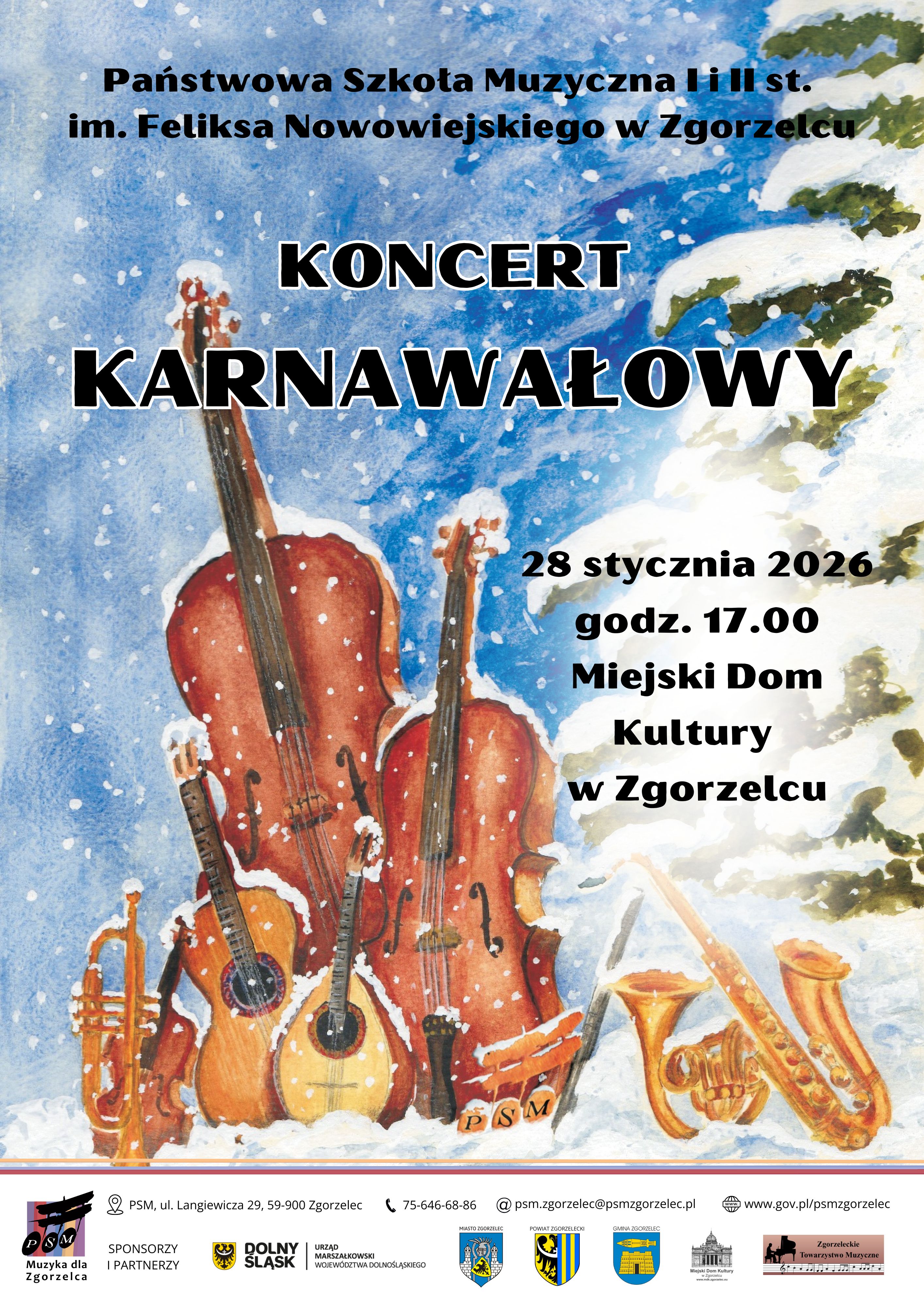 28 stycznia o godz. 17.00 w Sali Widowiskowej Miejskiego Domu Kultury odbędzie się Koncert Karnawałowy tradycyjnie organizowany przez Państwową Szkołę Muzyczną I i II stopnia im. Feliksa Nowowiejskiego w Zgorzelcu. Koncert odbywa się w ramach projektu "Muzyka dla Zgorzelca" dofinansowanego z budżetu Zarządu Województwa Dolnośląskiego, Miasta Zgorzelec, Gminy Zgorzelec, Powiatu Zgorzeleckiego oraz Zgorzeleckiego Towarzystwa Muzycznego.