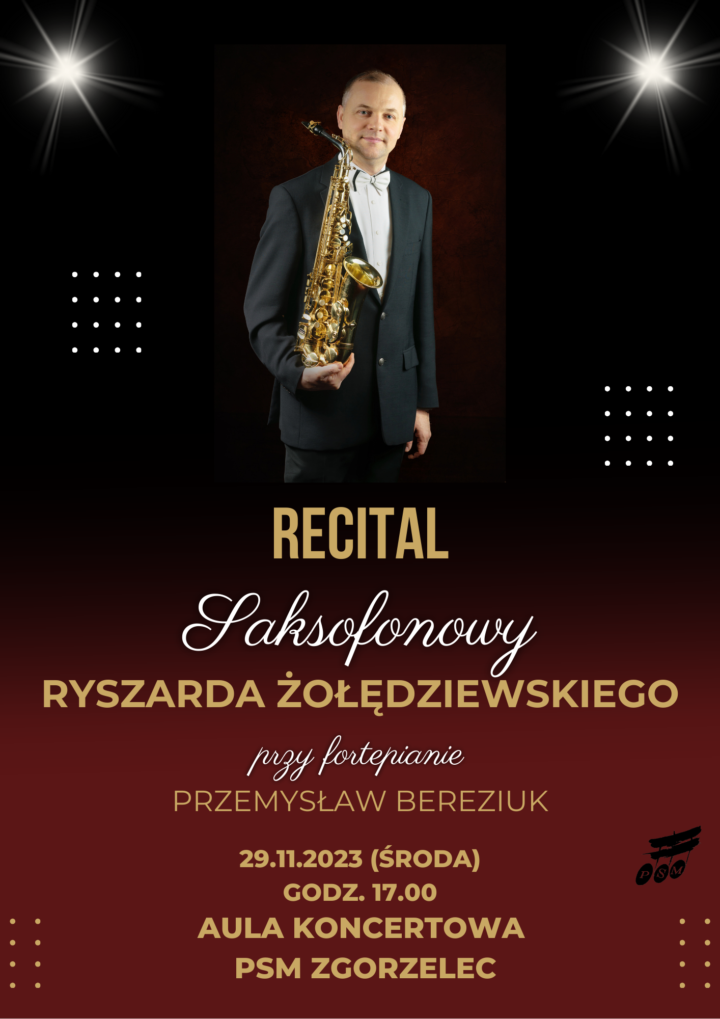 29 listopada o godz. 17.00 w Auli Koncertowej Państwowej Szkoły Muzycznej w Zgorzelcu przy ul. Langiewicza 29 odbędzie się Recital saksofonowy Ryszarda Żołędziewskiego, saksofonisty i wykładowcy Akademii Muzycznej im. Karola Lipińskiego we Wrocławiu. Przy fortepianie usłyszymy Przemysława Bereziuka, pedagoga zgorzeleckiej szkoły muzycznej.