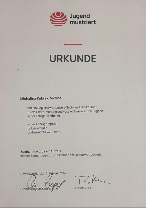 Michalina Kubrak, uczennica klasy skrzypiec Anny Krupy, wzięła udział w konkursie regionalnym Saksonia-Łużyce na muzykę instrumentalną i wokalną „Jugend musiziert” w kategorii SKRZYPCE. Konkurs odbył się 2 lutego 2025 roku w Hoyerswerdze w Niemczech.