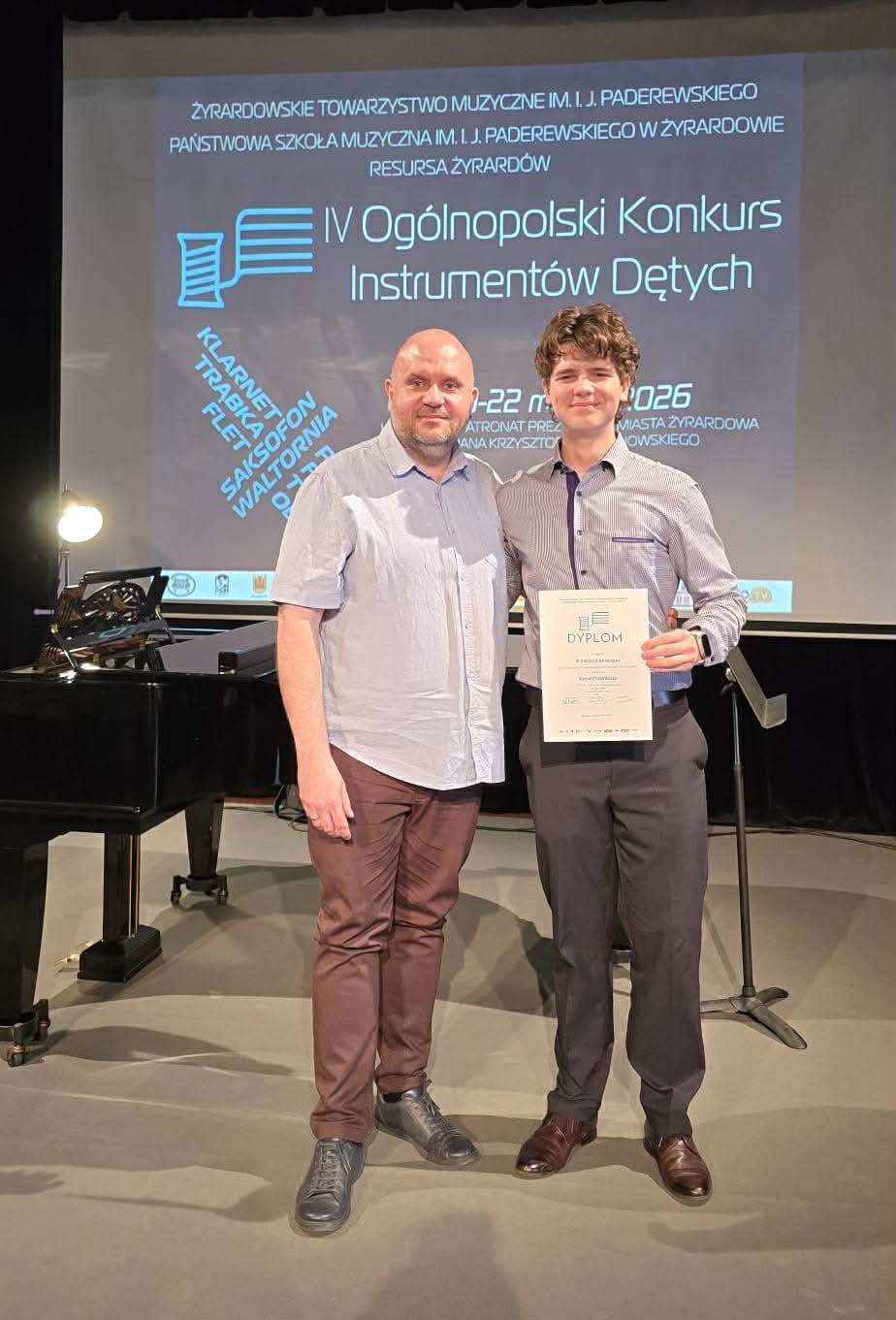 To wyjątkowe osiągnięcie ma szczególne znaczenie – dla Kamila był to pierwszy w życiu konkurs, a więc debiut na scenie konkursowej. Co więcej, jest to także pierwszy sukces nowo otwartej klasy puzonu, która funkcjonuje w naszej szkole od września 2024 roku.