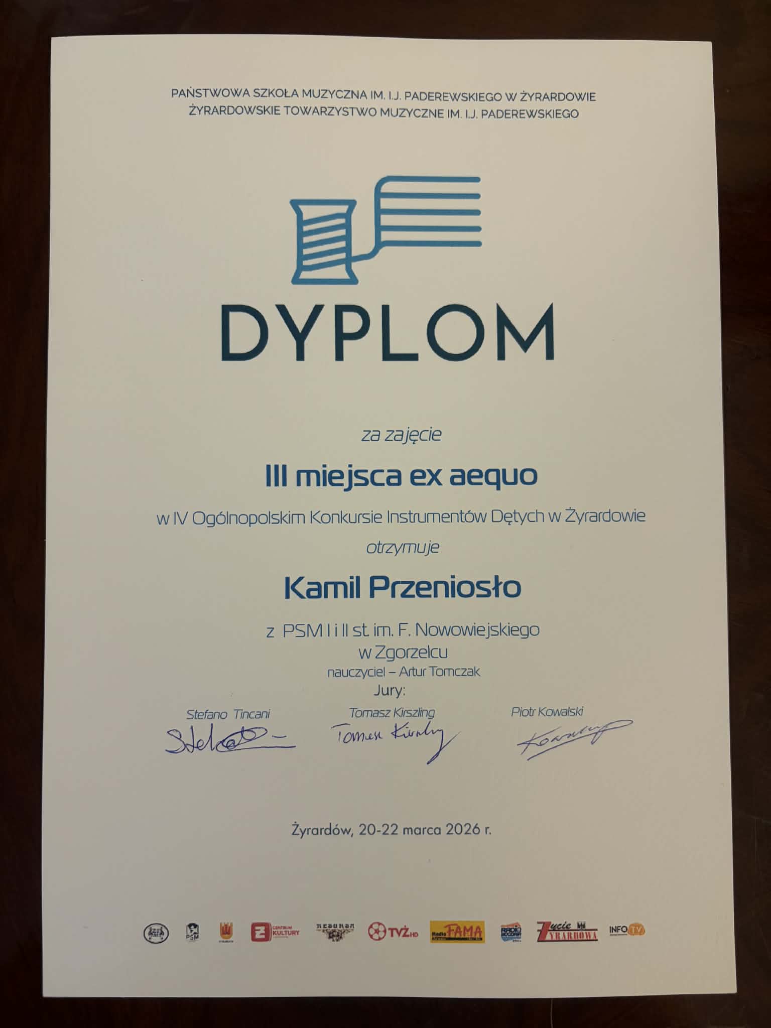 Z radością informujemy, że Kamil Przeniosło, uczeń klasy puzonu (kl. II/4) Artura Tomczaka, zdobył III miejsce na odbywającym się właśnie IV Ogólnopolskim Konkursie Instrumentów Dętych w Żyrardowie.