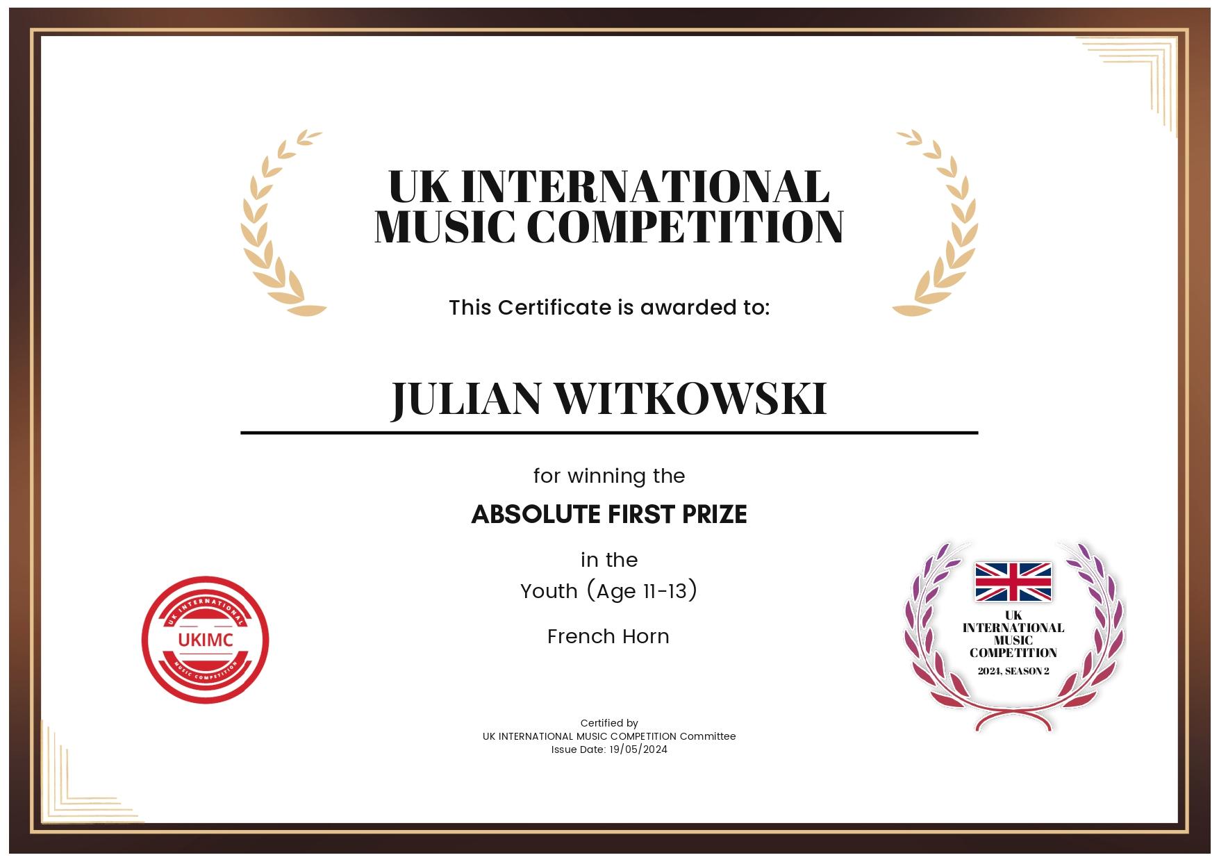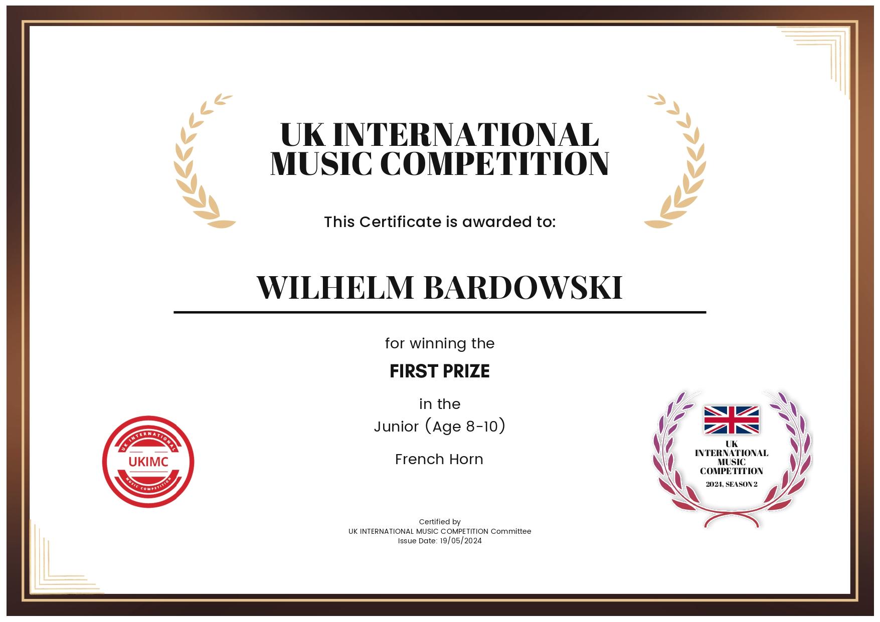 Wilhelm Bardowski, uczeń klasy III cyklu 6-letniego oraz Julian Witkowski, uczeń klasy V cyklu 6-letniego wzięli udział w UK International Music Competition.