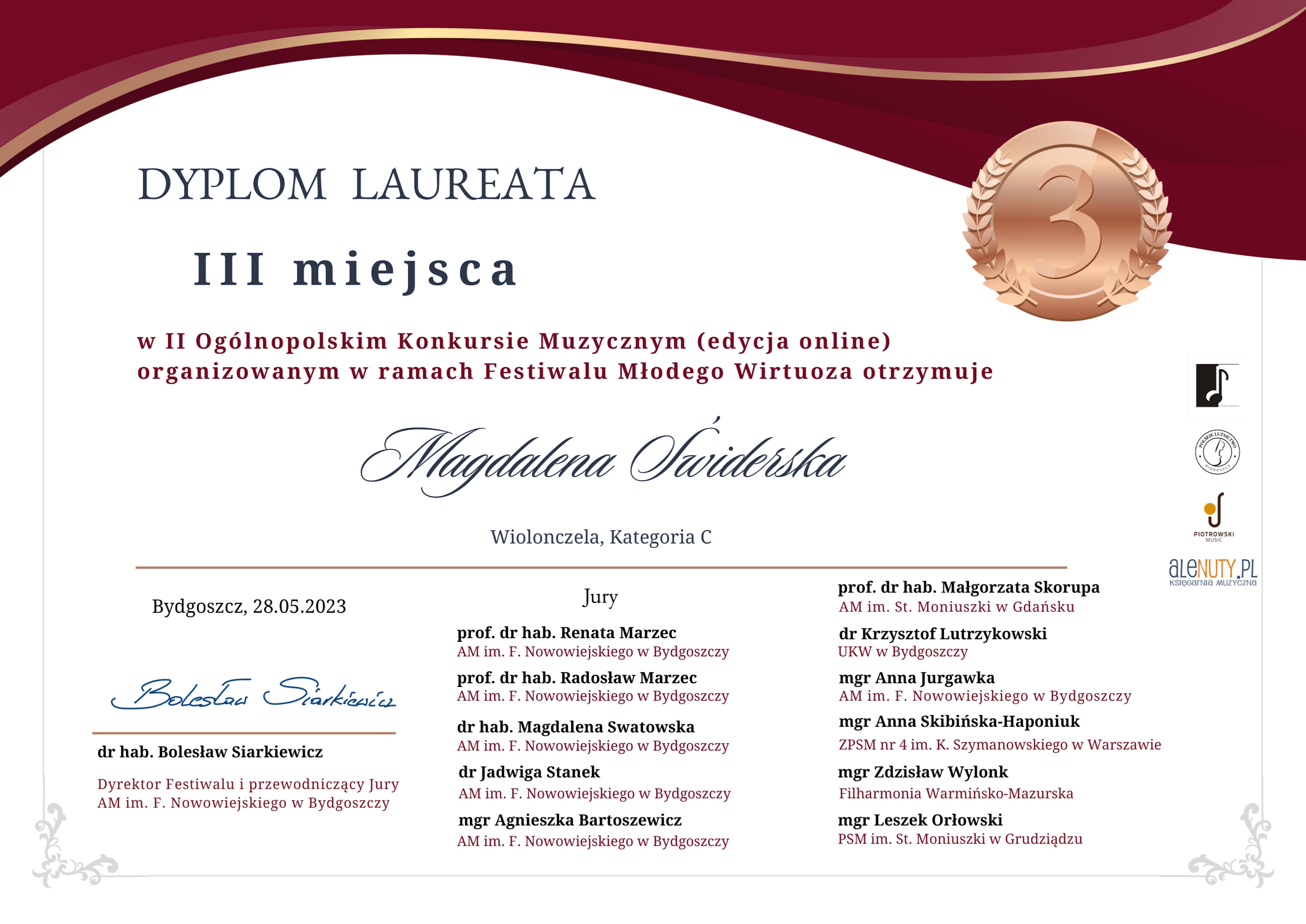Magdalena Świderska z klasy wiolonczeli mgr Doroty Straburzyńskiej została laureatką III miejsca w II Ogólnopolskim Konkursie Muzycznym (edycja online) organizowanym w ramach Festiwalu Młodego Wirtuoza w Bydgoszczy.