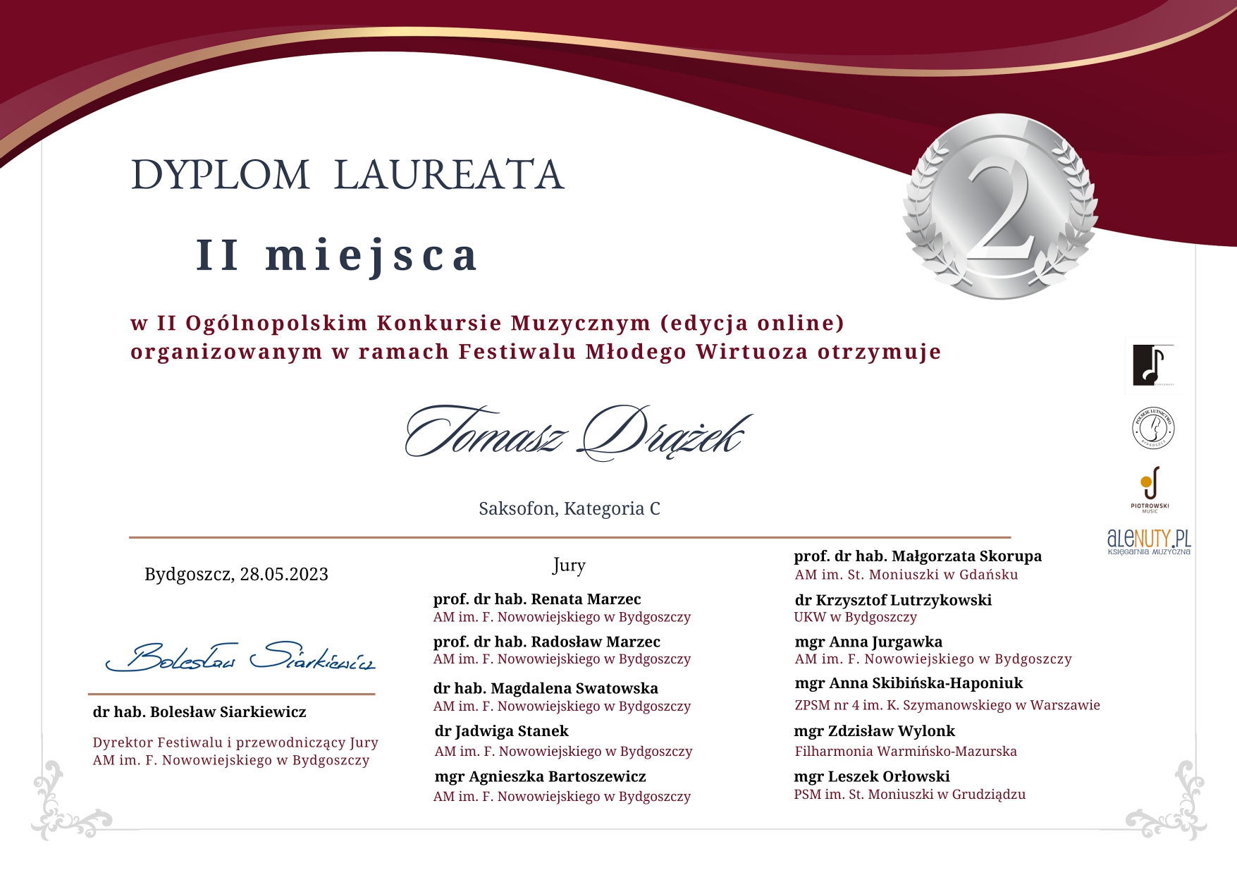 Pod koniec roku szkolnego 2022/2023 otrzymaliśmy fantastyczne wieści. Podczas II Ogólnopolskiego Konkursu Muzycznego w ramach Festiwalu Młodego Wirtuoza Tomasz Drążek zdobył II miejsce, a Leon Zieja III miejsce.