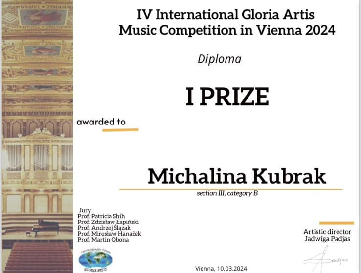 Uczennice naszej szkoły: Sophie Mytnik, kl. V/6, Michalina Kubrak, kl. I/II st. oraz Weronika Różańska kl. III/II st. wzięły udział w IV Międzynarodowym Konkursie Muzycznym Gloria Artis w Wiedniu. Konkurs odbywał się w formule on-line.