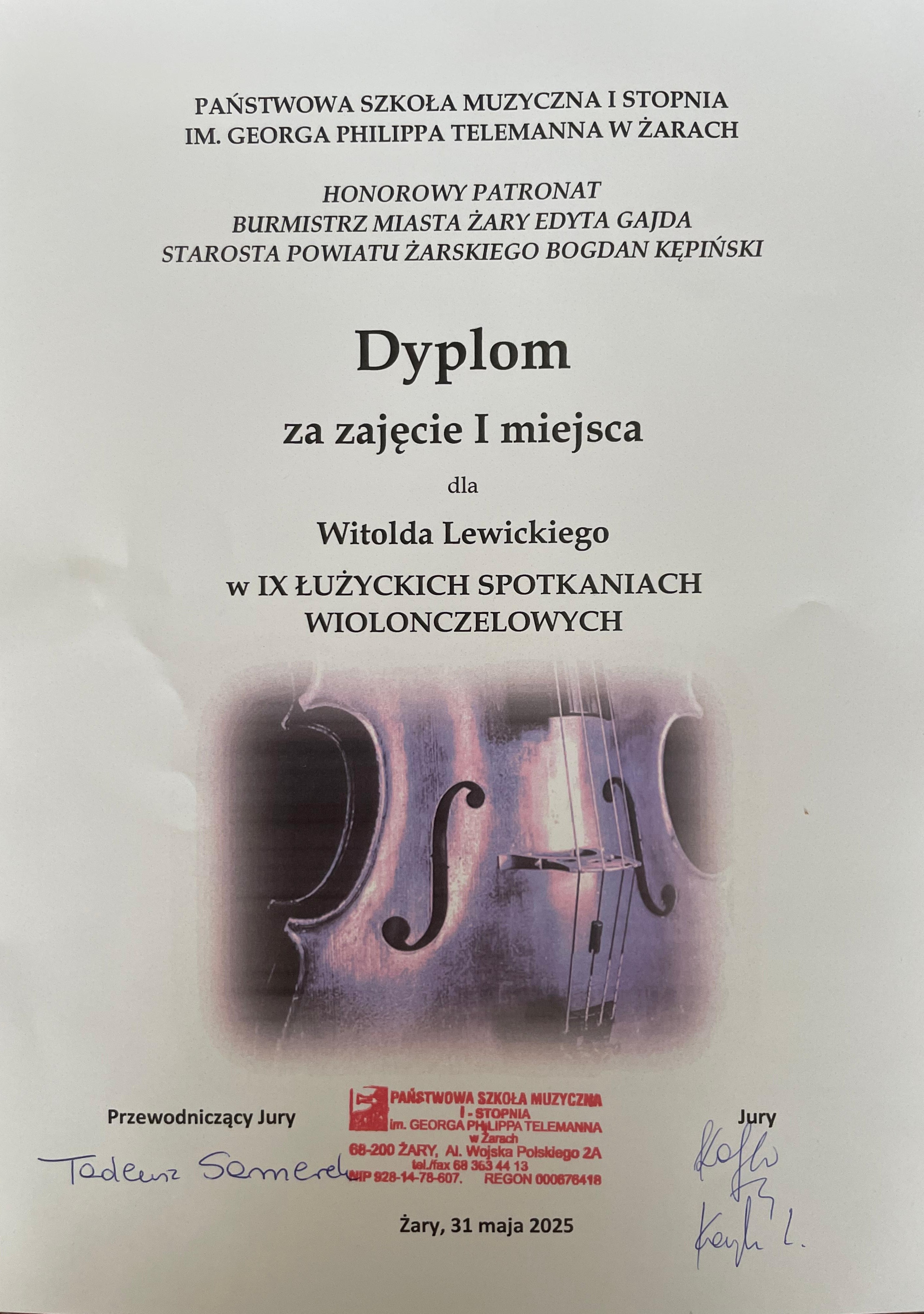 Z wielką radością informujemy o kolejnych znaczących osiągnięciach Witolda Lewickiego - ucznia II klasy wiolonczeli (cykl sześcioletni) w prestiżowych konkursach muzycznych w 2025 roku.