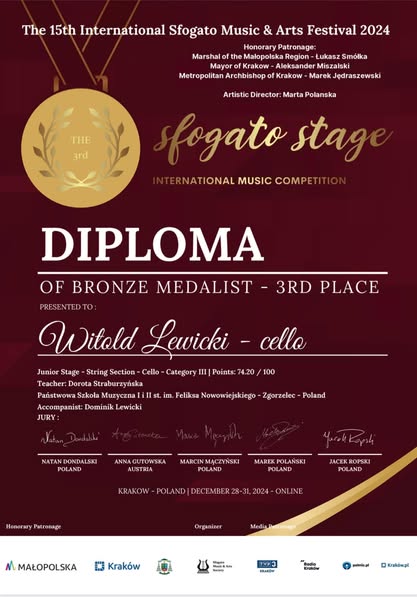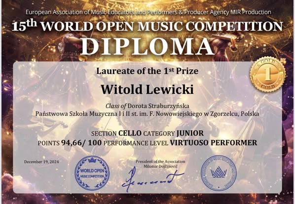 Wyjątkowo pięknie zakończył się rok 2024 dla jednego z naszych najmłodszych adeptów gry na wiolonczeli. Witold Lewicki (uczeń klasy II cyklu 6-letniego) wziął w grudniu udział w 3 konkursach i osiągnął wspaniałe wyniki: