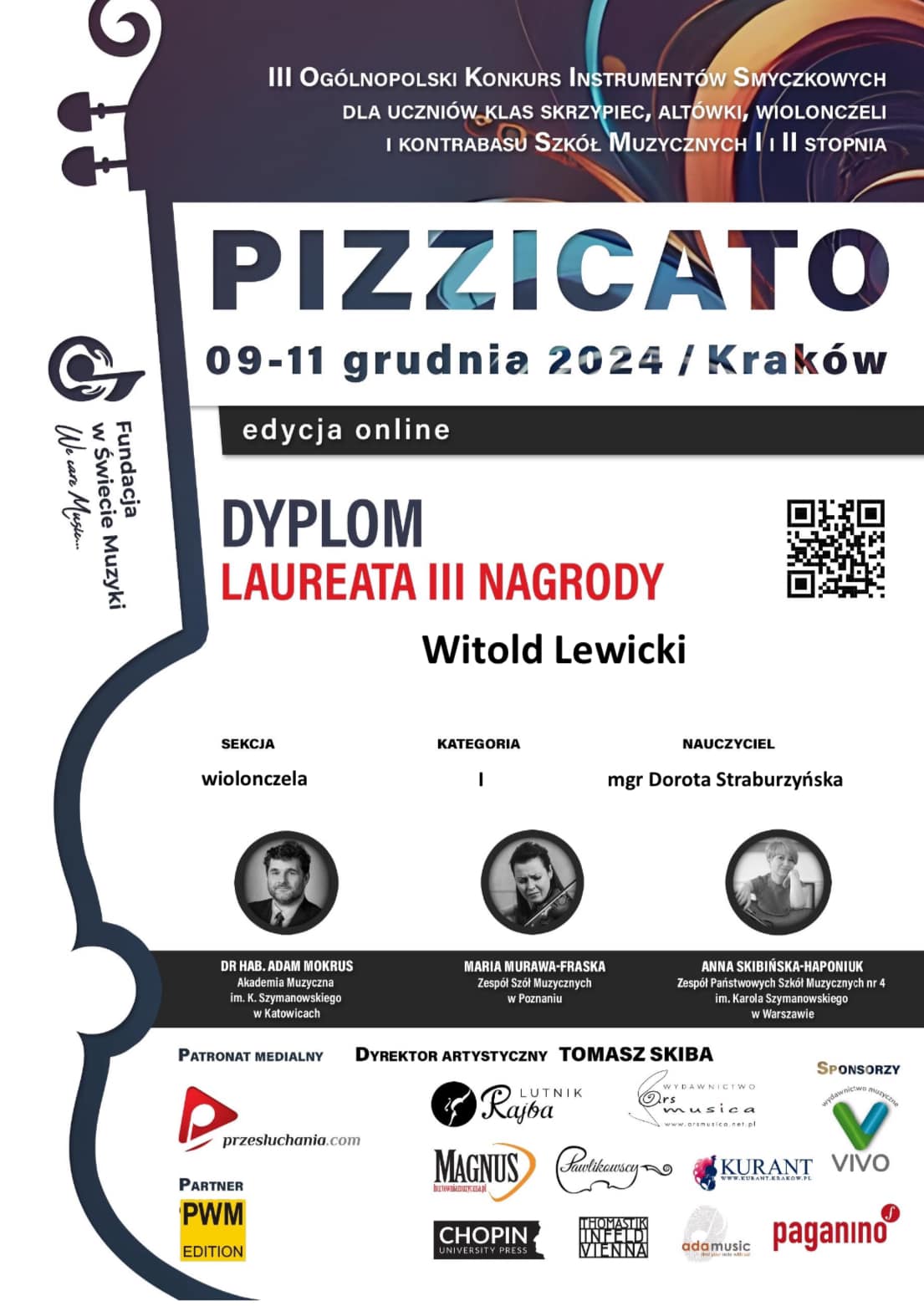 Dyplomy uznania otrzymała także nauczycielka gry na wiolonczeli – Dorota Straburzyńska. Witkowi towarzyszył przy fortepianie Dominik Lewicki.