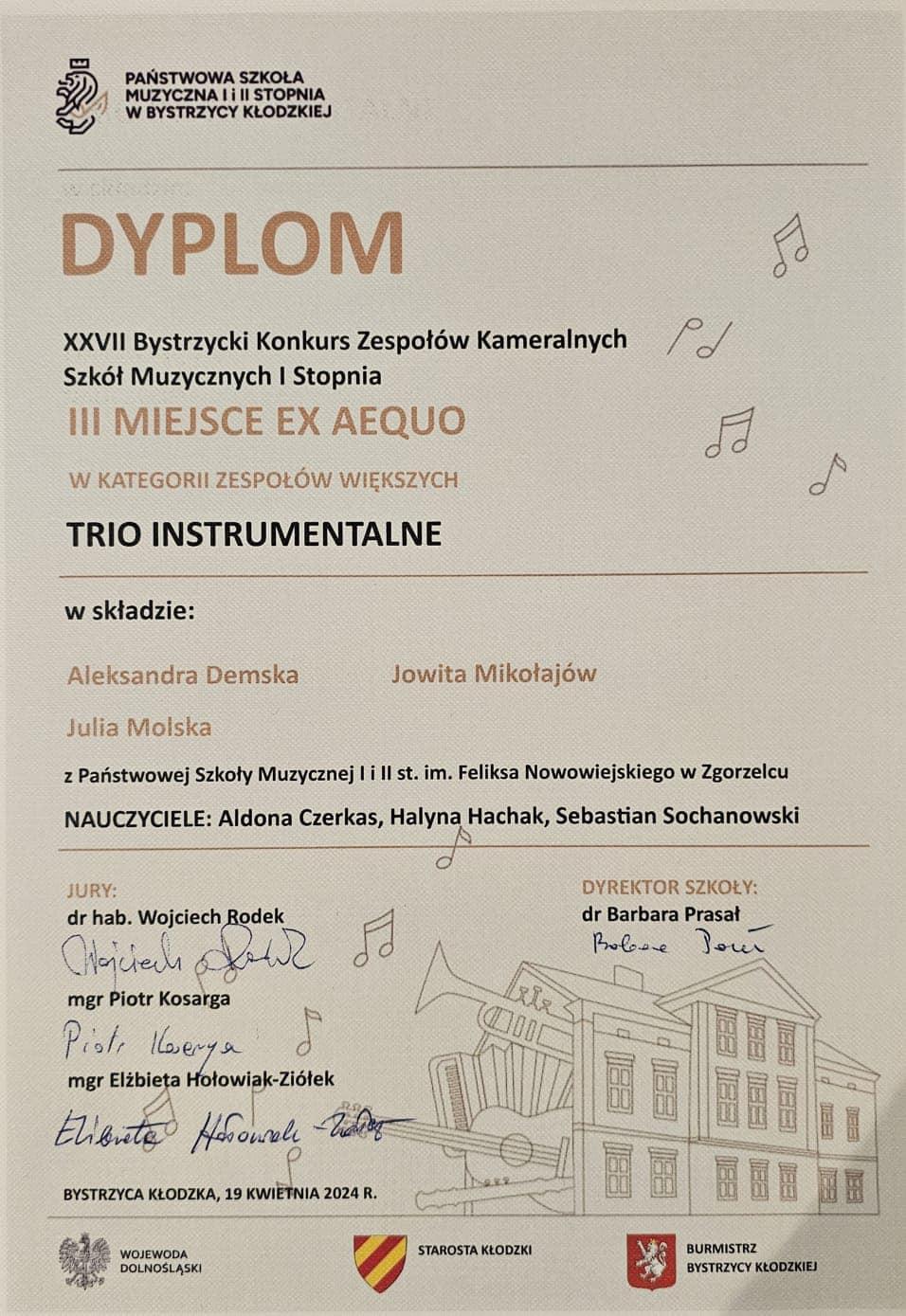 19 kwietnia odbył się Bystrzycki Konkurs Zespołów Kameralnych Szkół Muzycznych I Stopnia organizowany przez Państwową Szkołę Muzyczną I i II stopnia w Bystrzycy Kłodzkiej. Naszą szkołę reprezentował zespół kameralny w składzie: Aleksandra Demska - skrzypce, Julia Molska - klarnet, Jowita Mikołajów - fortepian. Zespół w swojej kategorii zajął 3 miejsce