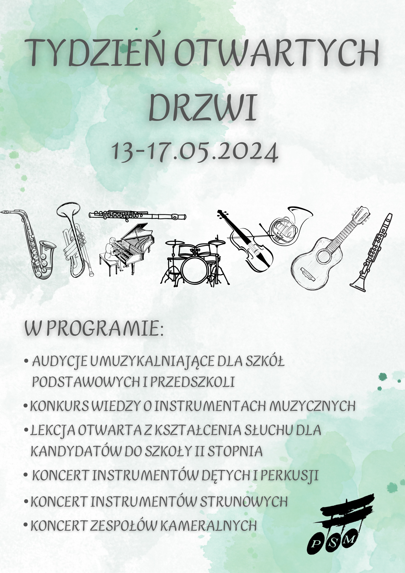 Od środy do piątku o godzinie 16.00 odbywać się będą koncerty tematyczne w wykonaniu uczniów PSM, podczas których będzie można posłuchać i pooglądać wybraną grupę instrumentów. Chciałbyś rozpocząć grać na altówce? Przyjdź koniecznie w czwartek! A może interesuje Cię puzon lub flet? Musisz być w środę! Nie jesteś zdecydowany? Zapraszamy w piątek!