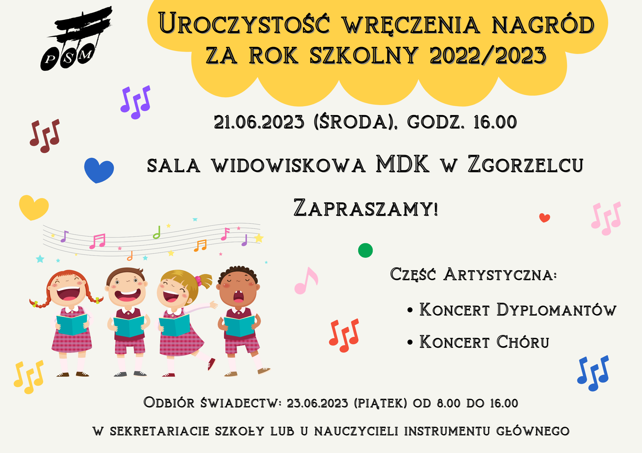 Serdecznie zapraszamy wszystkich uczniów i rodziców na uroczystość wręczenia nagród za rok szkolny 2022/2023, która odbędzie się w środę, 21 czerwca o godzinie 16.00 w sali widowiskowej MDK w Zgorzelcu.