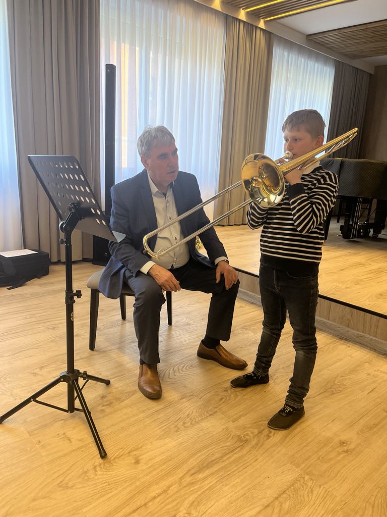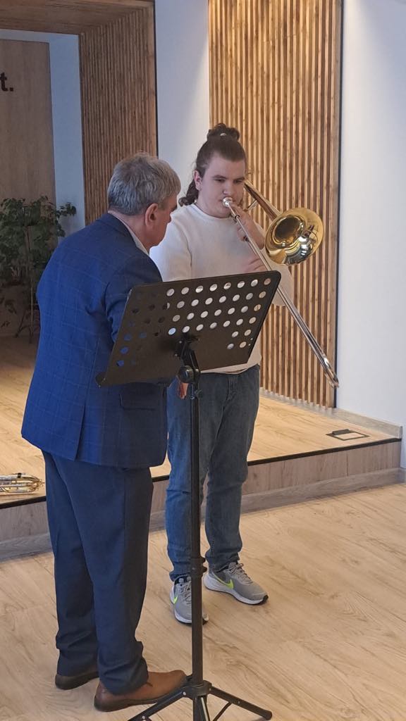 W piątek (04.05) w naszej szkole odbyły się warsztaty puzonowe. Uczniowie pod okiem prof. Zdzisława Stolarczyka (UMFC Warszawa) doskonalili swoje umiejętności.