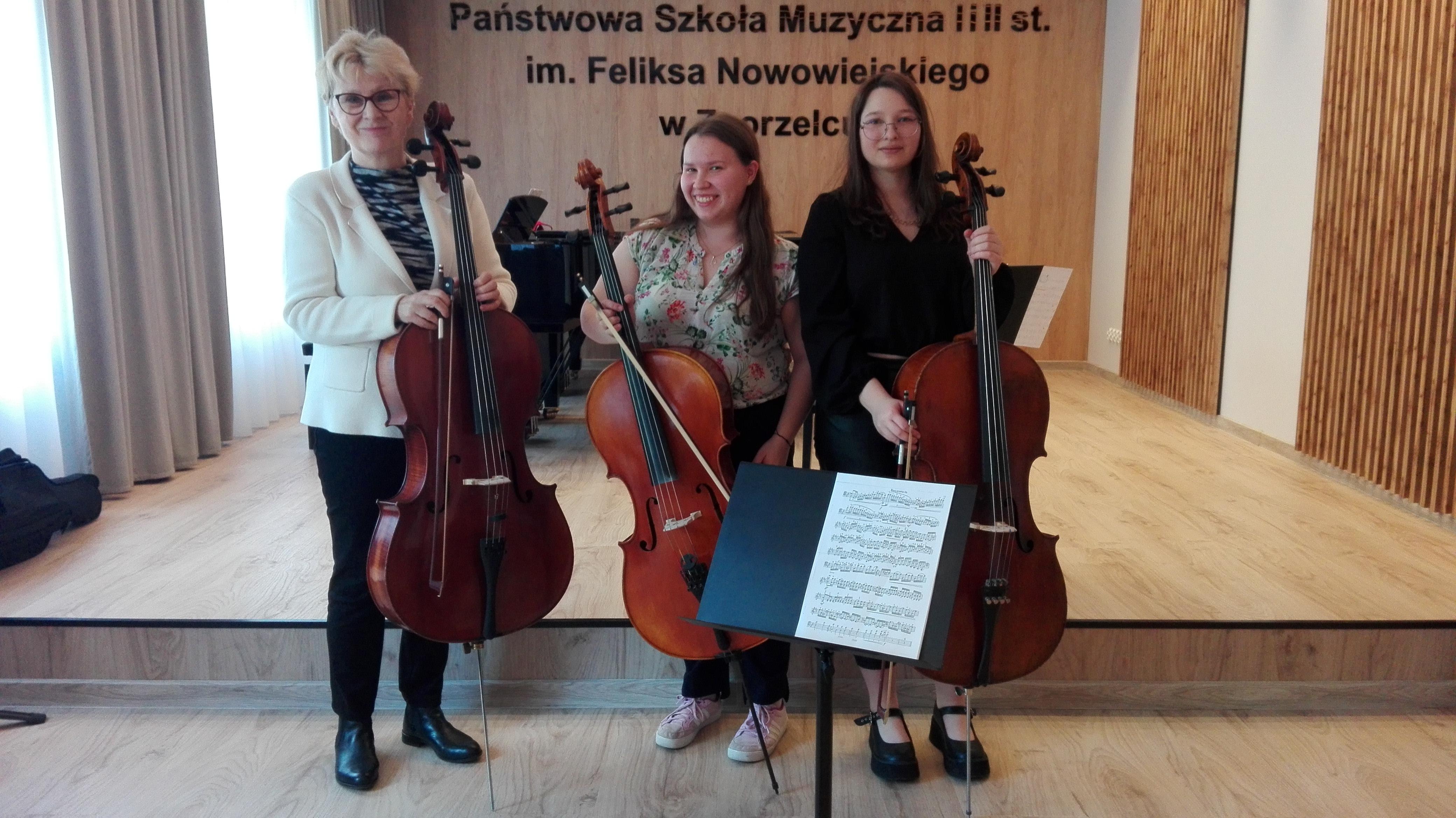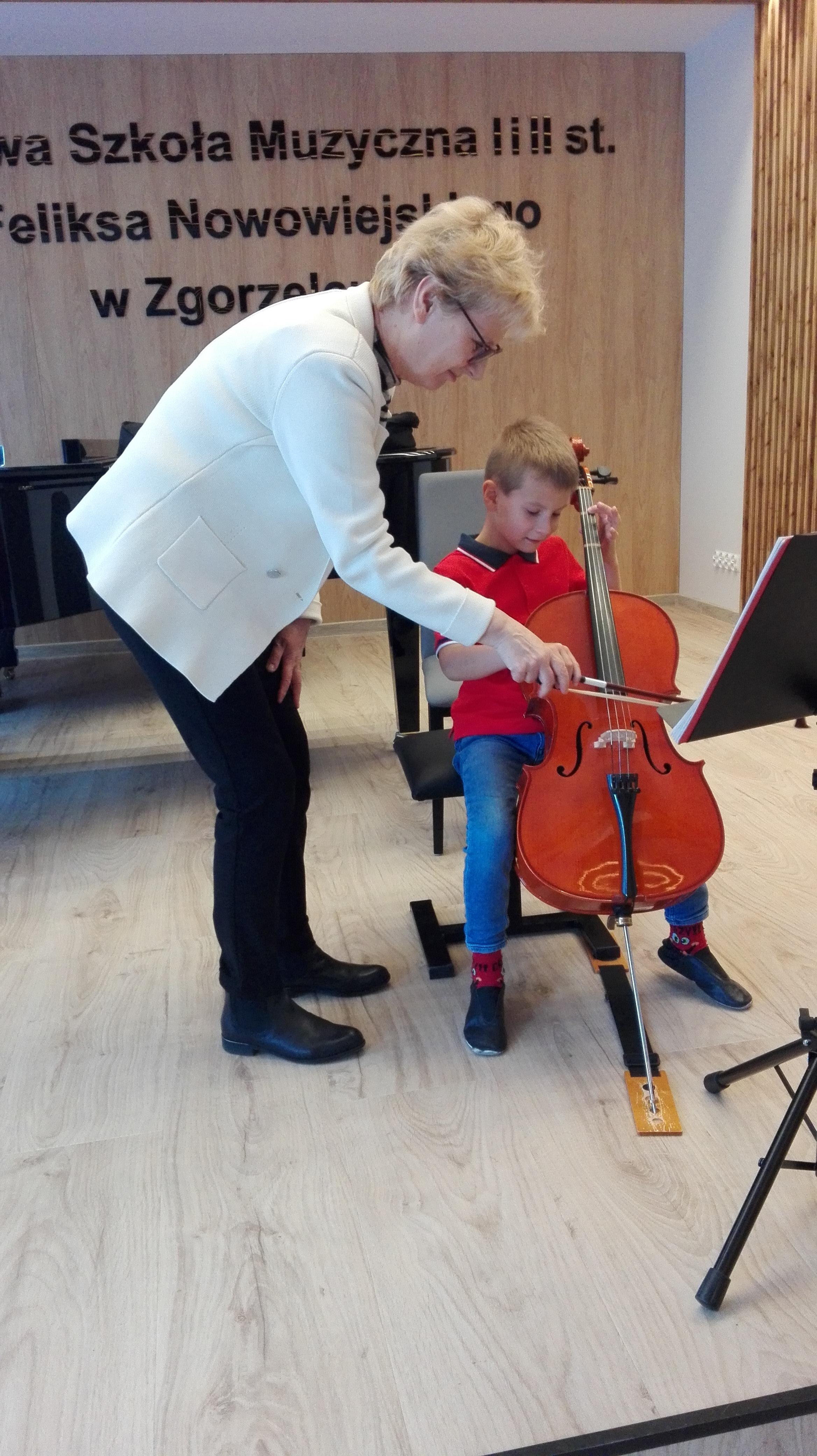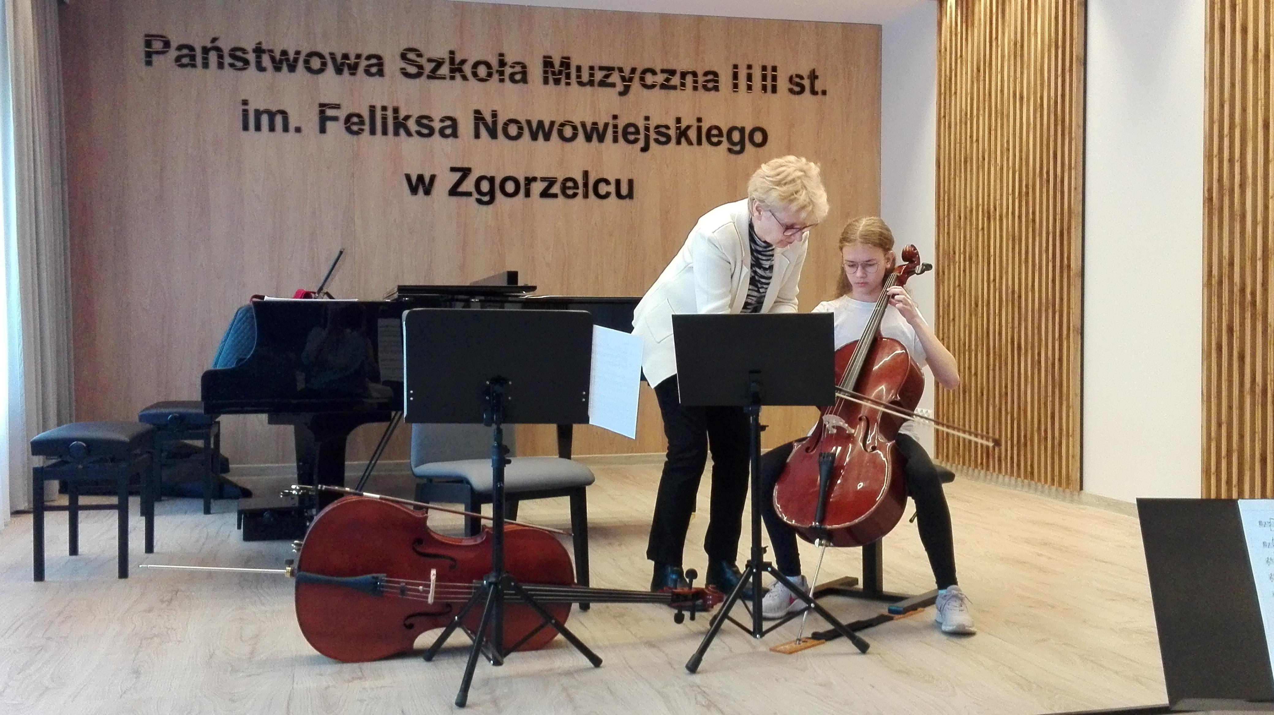 W dniu 26 kwietnia 2024 r. gościliśmy w naszej szkole panią prof. dr hab. Lidię Grzankę-Urbaniak z Akademii Muzycznej im. K. Lipińskiego we Wrocławiu, która poprowadziła warsztaty wiolonczelowe z uczniami p. Doroty Straburzyńskiej.