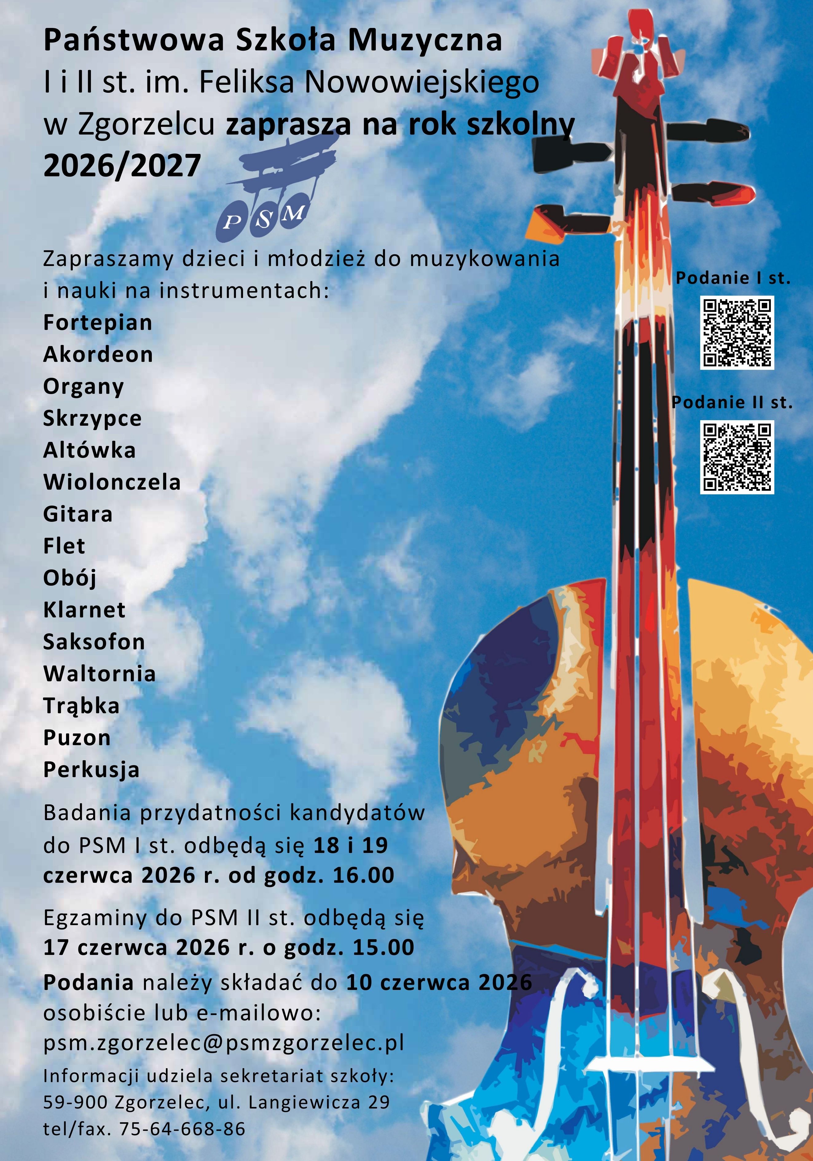 - Egzamin wstępny do szkoły II stopnia: 17 czerwca 2026, godz. 15.00 (kształcenie słuchu), godz. 16.00 (gra na instrumencie)