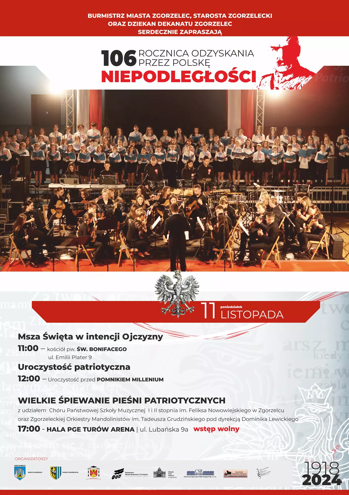 11 listopada o godz. 17.00 w PGE Turów Arena w Zgorzelcu przy ul. Lubańskiej 9a odbędzie się Wielkie Śpiewanie Pieśni Patriotycznych. Z okazji 106. Rocznicy Odzyskania przez Polskę Niepodległości koncert będzie miał uroczysty charakter i wyjątkową oprawę: zaśpiewa Chór Państwowej Szkoły Muzycznej I i II stopnia im. Feliksa Nowowiejskiego w Zgorzelcu z towarzyszeniem Zgorzeleckiej Orkiestry Mandolinistów im. Tadeusza Grudzińskiego pod dyrekcją Dominika Lewickiego. Chór przygotował Przemysław Mazurek. Aranżacje pieśni patriotycznych przygotowali Joanna i Dominik Lewiccy.