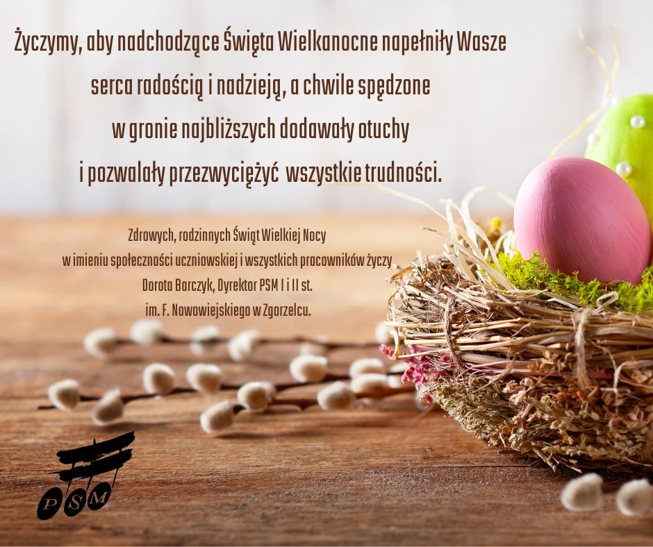 Zdrowych, rodzinnych Świąt Wielkiej Nocy w imieniu społeczności uczniowskiej i wszystkich pracowników życzy Dorota Barczyk, Dyrektor PSM I i II st. im. F. Nowowiejskiego w Zgorzelcu.