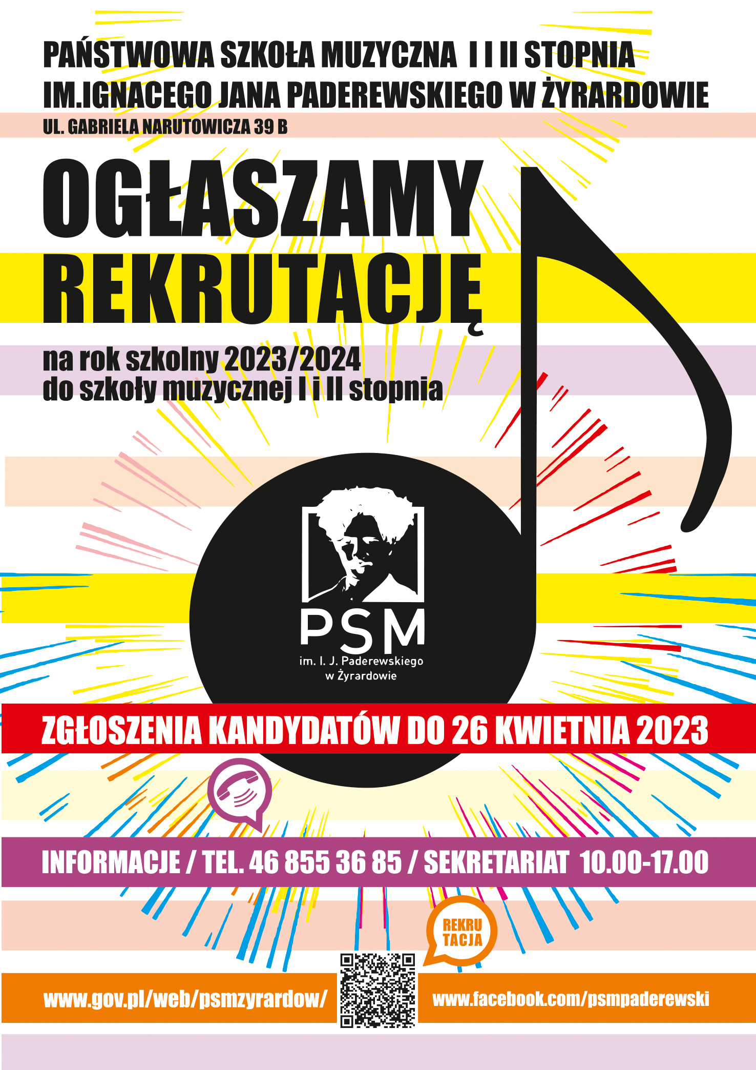 Rekrutacja na rok szkolny 2023/2024 PSM I i II stopnia im.Ignacego Jana Paderewskiego w Żyrardowie