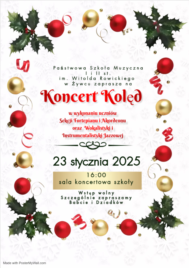 Serdecznie zapraszamy 23 stycznia na Koncert Kolęd Sekcji Fortepianu i Akordeonu, Wokalistyki i Instrumentalistyki Jazzowej