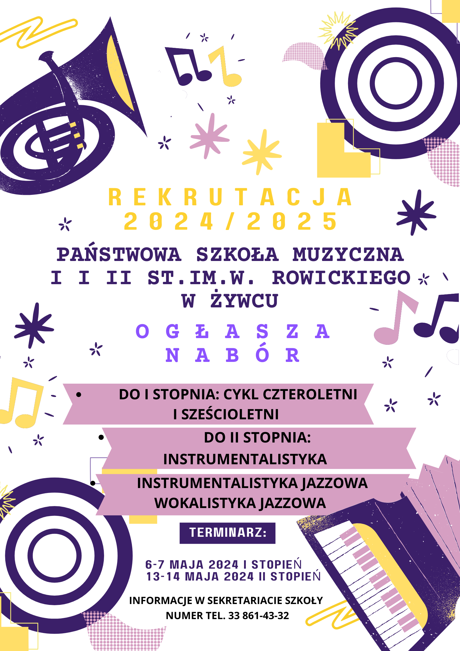 Państwowa Szkoła Muzyczna I i II stopnia im. W. Rowickiego w Żywcu ogłasza nabór na rok szkolny 2024/2025.