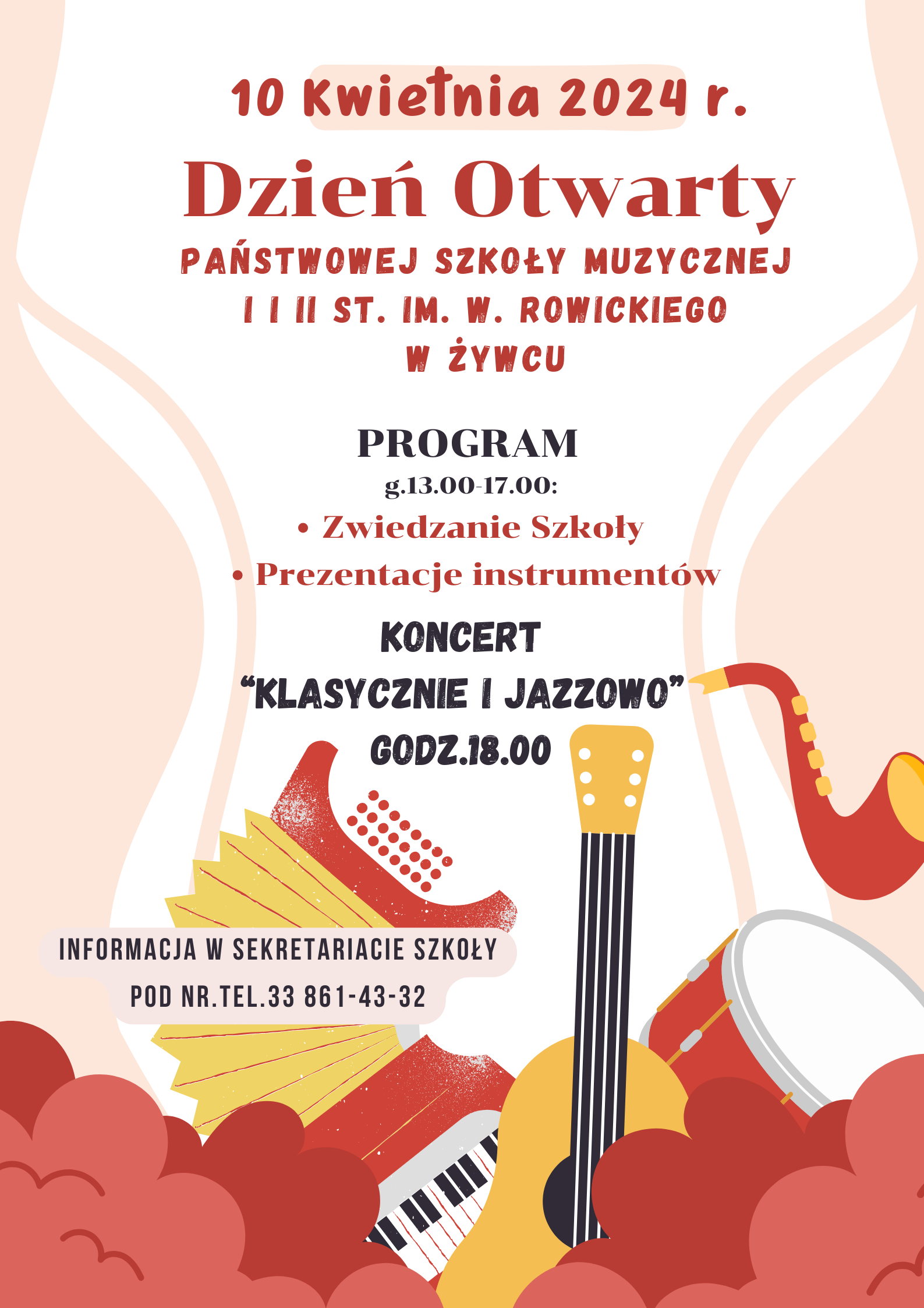 W dniu 10 kwietnia 2024 r. od godziny 13.00 – 17.00 zapraszamy dzieci i młodzież zainteresowane edukacją muzyczną w naszej placówce do zwiedzania Szkoły, podczas którego będzie można poznać szeroką gamę instrumentów muzycznych, które zaprezentują nauczyciele.