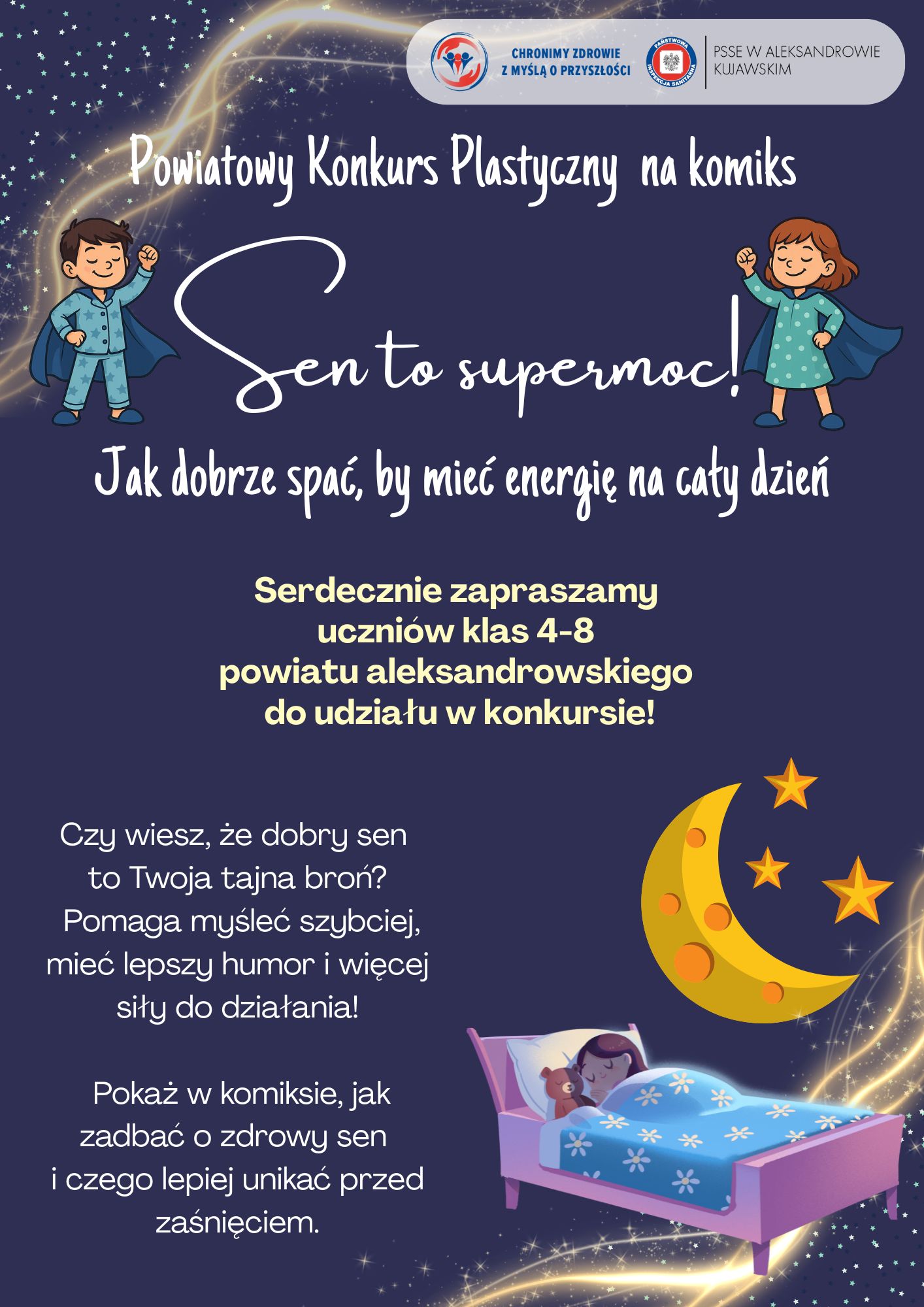 Powiatowa Stacja Sanitarno-Epidemiologiczna w Aleksandrowie Kujawskim zaprasza uczniów klas IV–VIII szkół podstawowych do udziału w Powiatowym Konkursie Plastycznym na komiks promujący higienę snu pod hasłem: