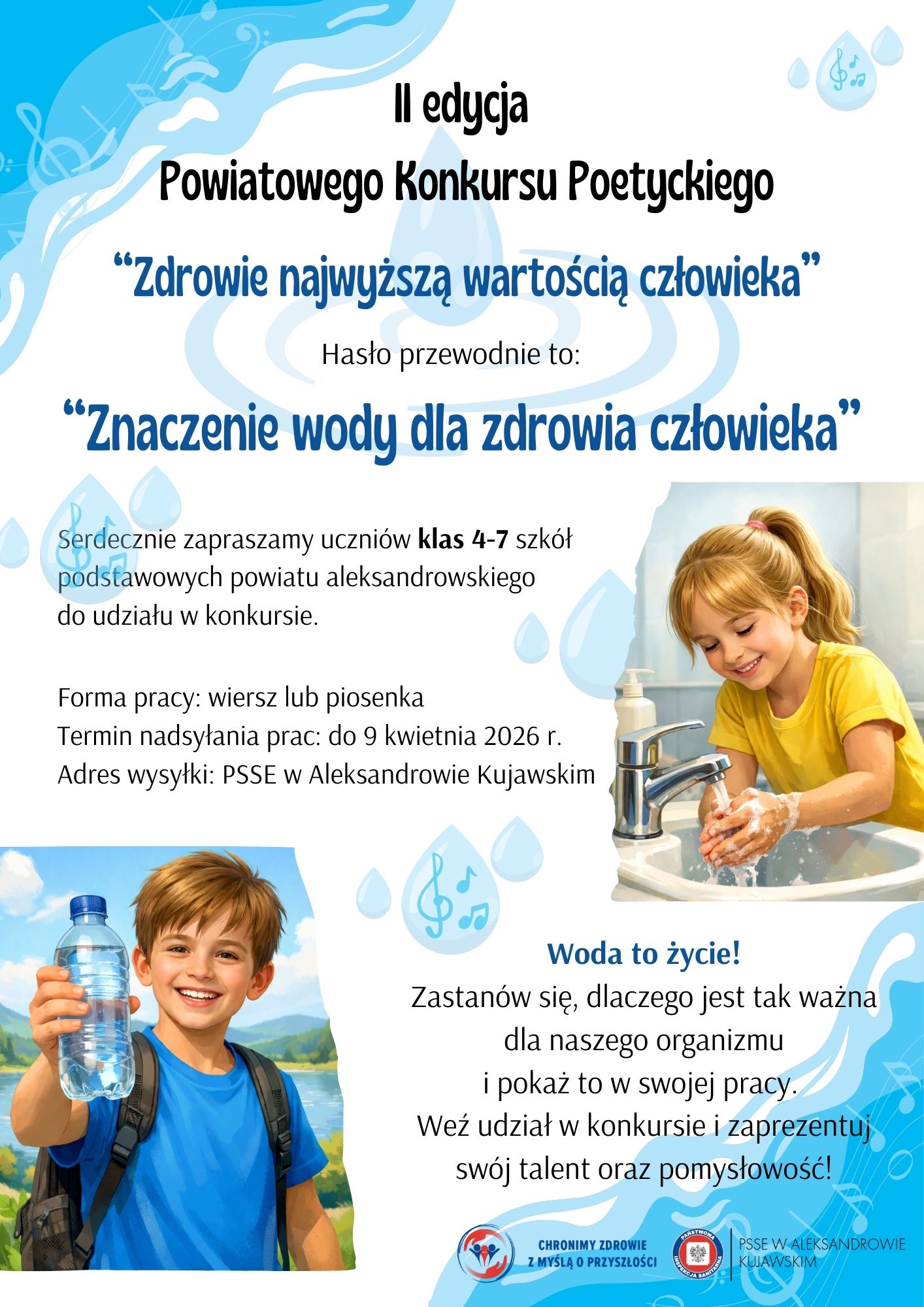 W ramach obchodów Światowego Dnia Zdrowia zapraszamy uczniów klas IV–VII szkół podstawowych do udziału w II edycji Powiatowego Konkursu Poetyckiego pn. „Zdrowie najwyższą wartością człowieka”. Tegoroczna edycja odbywa się pod hasłem: „Znaczenie wody dla zdrowia człowieka”.