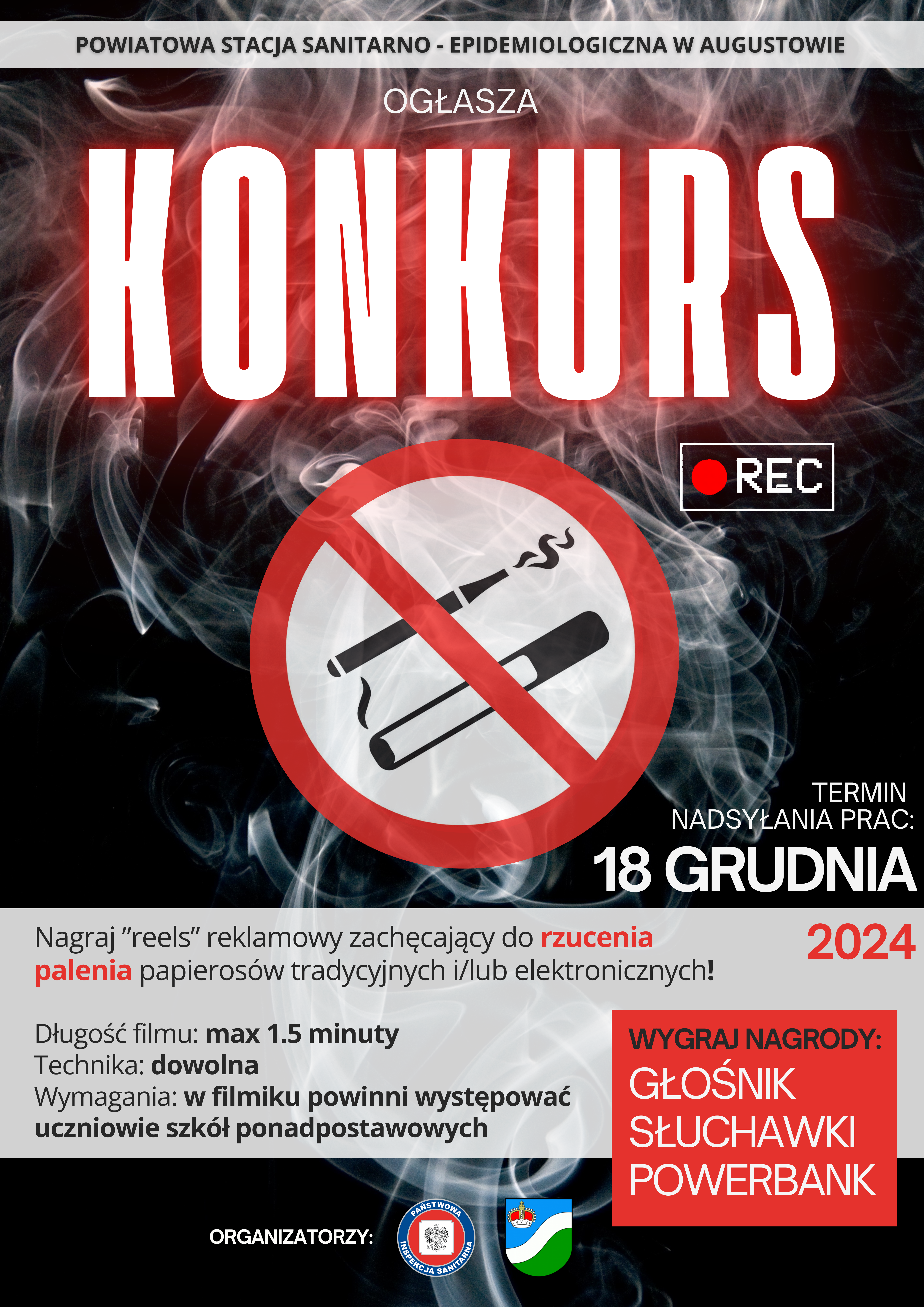 W związku z obchodami Światowego Dnia Rzucania Palenia, Państwowy Powiatowy Inspektor Sanitarny w Augustowie zaprasza do udziału w konkursie filmowym dla uczniów szkół ponadpodstawowych z powiatu augustowskiego.