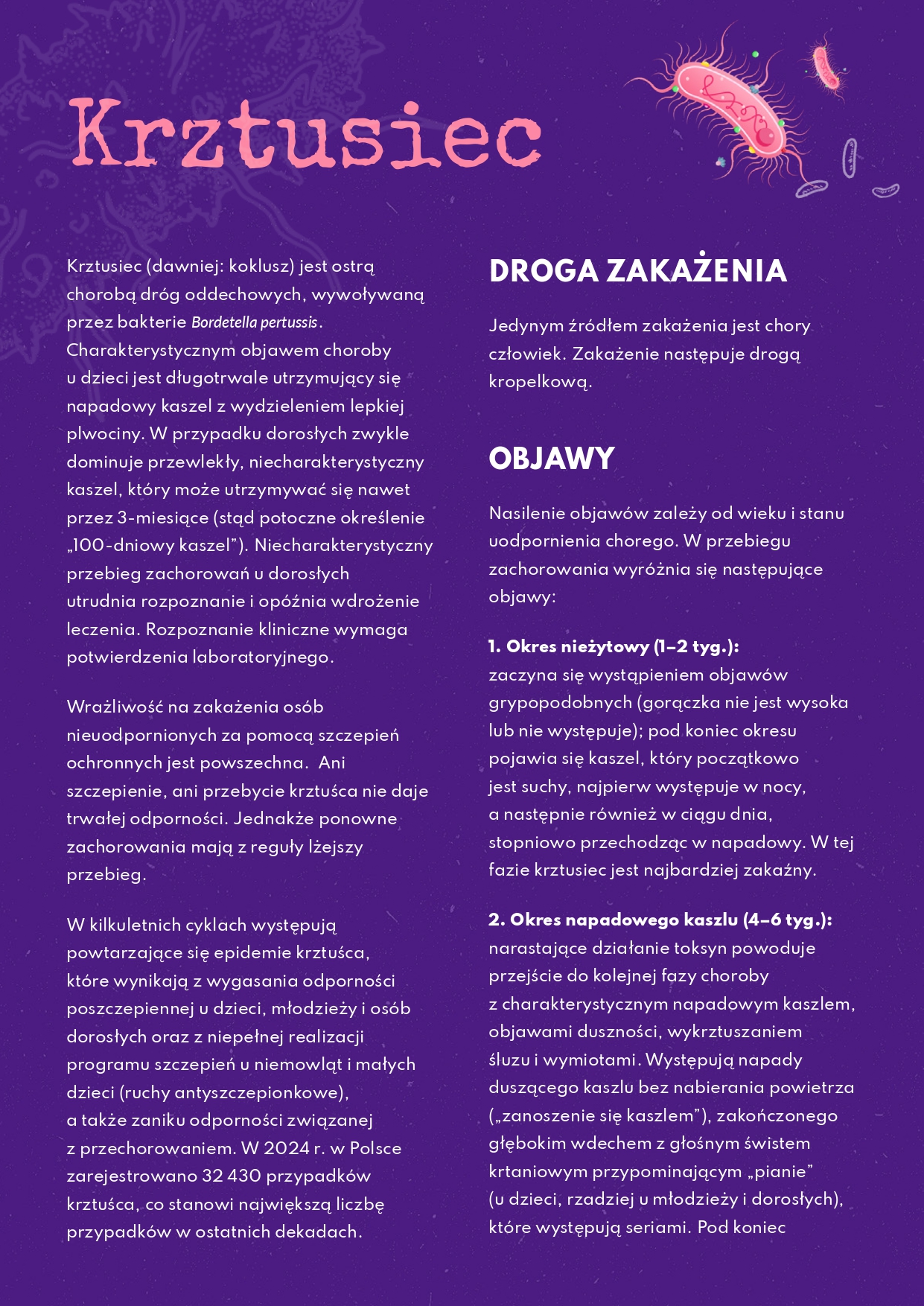 Z danych epidemiologicznych dostępnych na stronie Narodowego Instytutu Zdrowia Publicznego- Państwowego Zakładu Higieny wynika, że od początku bieżącego roku do 31 października 2024 odnotowano w Polsce 23783 przypadki krztuśca, co stanowi ponad 42. krotny wzrost w porównaniu do analogicznego okresu roku poprzedniego (559 przypadków ) Hospitalizowano z powodu krztuśca prawie 2800 osób.