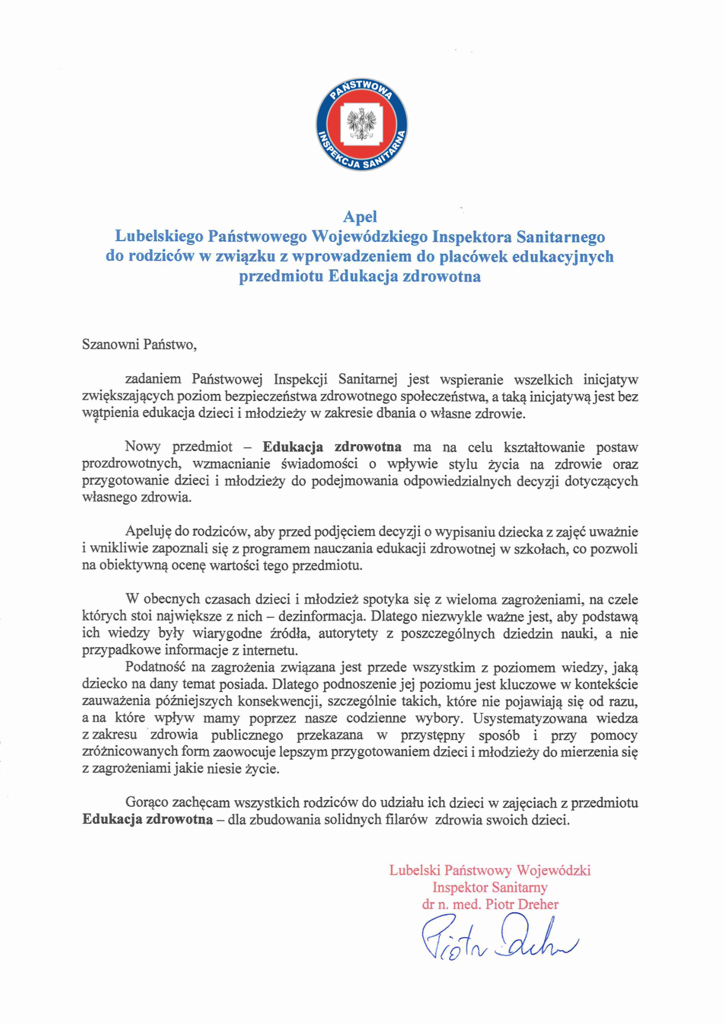Apel Lubelskiego Państwowego Wojewódzkiego Inspektora Sanitarnego do rodziców w związku z wprowadzeniem do placówek edukacyjnych przedmiotu Edukacja zdrowotna