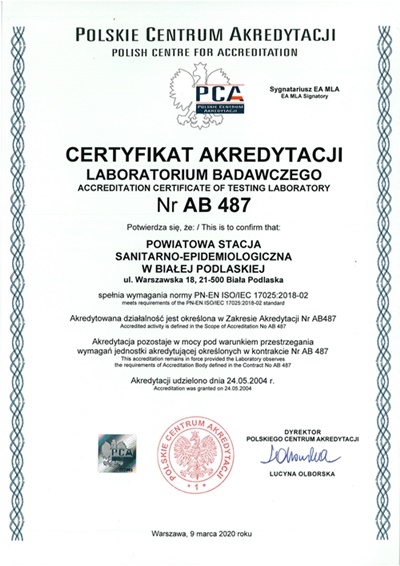 W 2004 roku Polskie Centrum Akredytacji przyznało Oddziałowi Laboratoryjnemu Powiatowej Stacji Sanitarno-Epidemiologicznej w Białej Podlaskiej Certyfikat Akredytacji Laboratorium Badawczego nr. AB487. Certyfikat ten potwierdza zgodność ustanowionego i wdrożonego systemu zarządzania opartego na normie PN-EN ISO/IEC 17025 „Ogólne wymagania dotyczące laboratoriów badawczych i wzorcujących”.