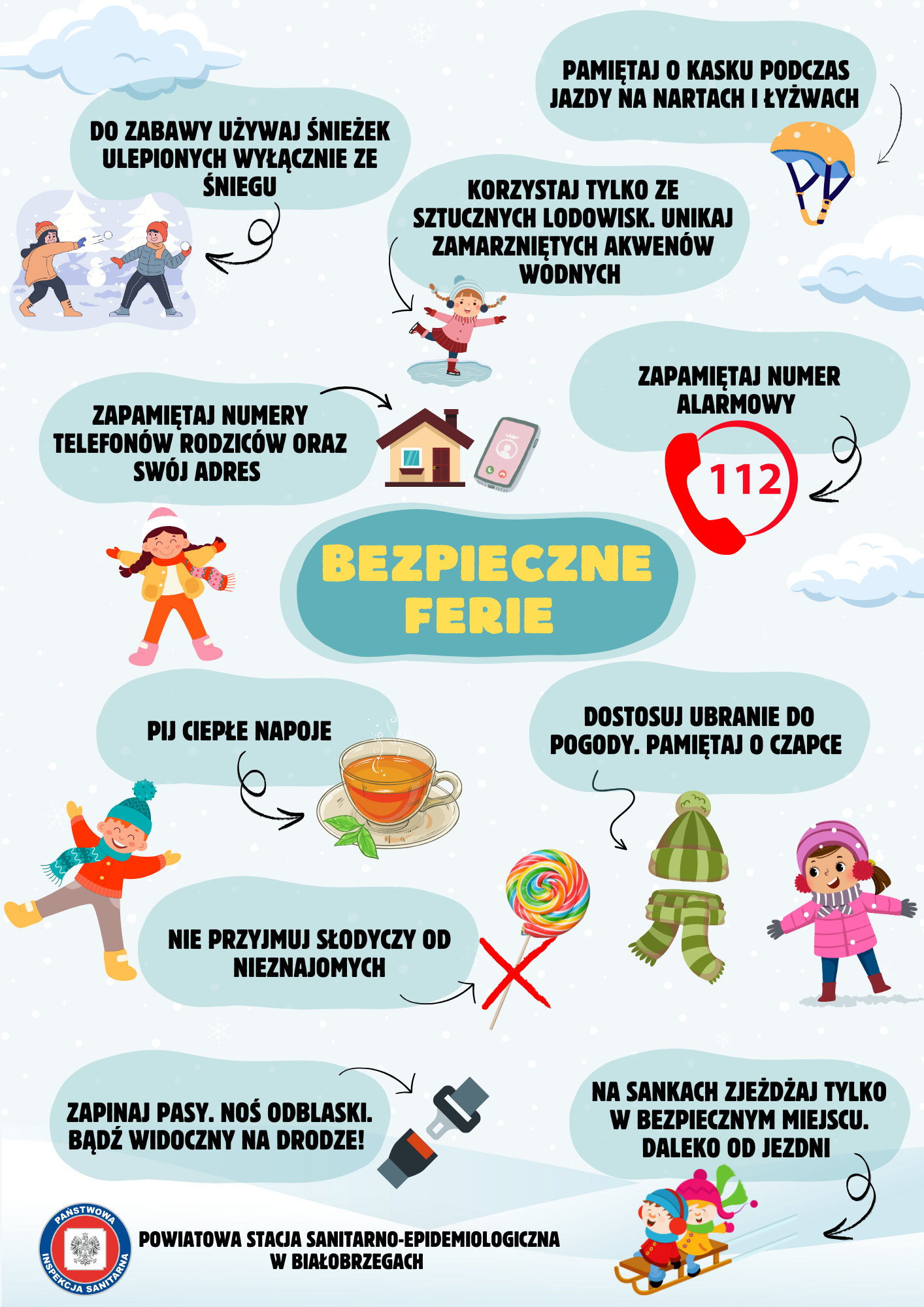 Nie zapominajmy, że czas wolny od nauki nie jest okresem wolnym od dbania o własne zdrowie. Poniżej znajduje się kilka zasad, które są doskonałym kierunkowskazem gwarantującym bezpieczne spędzenie ferii zimowych.