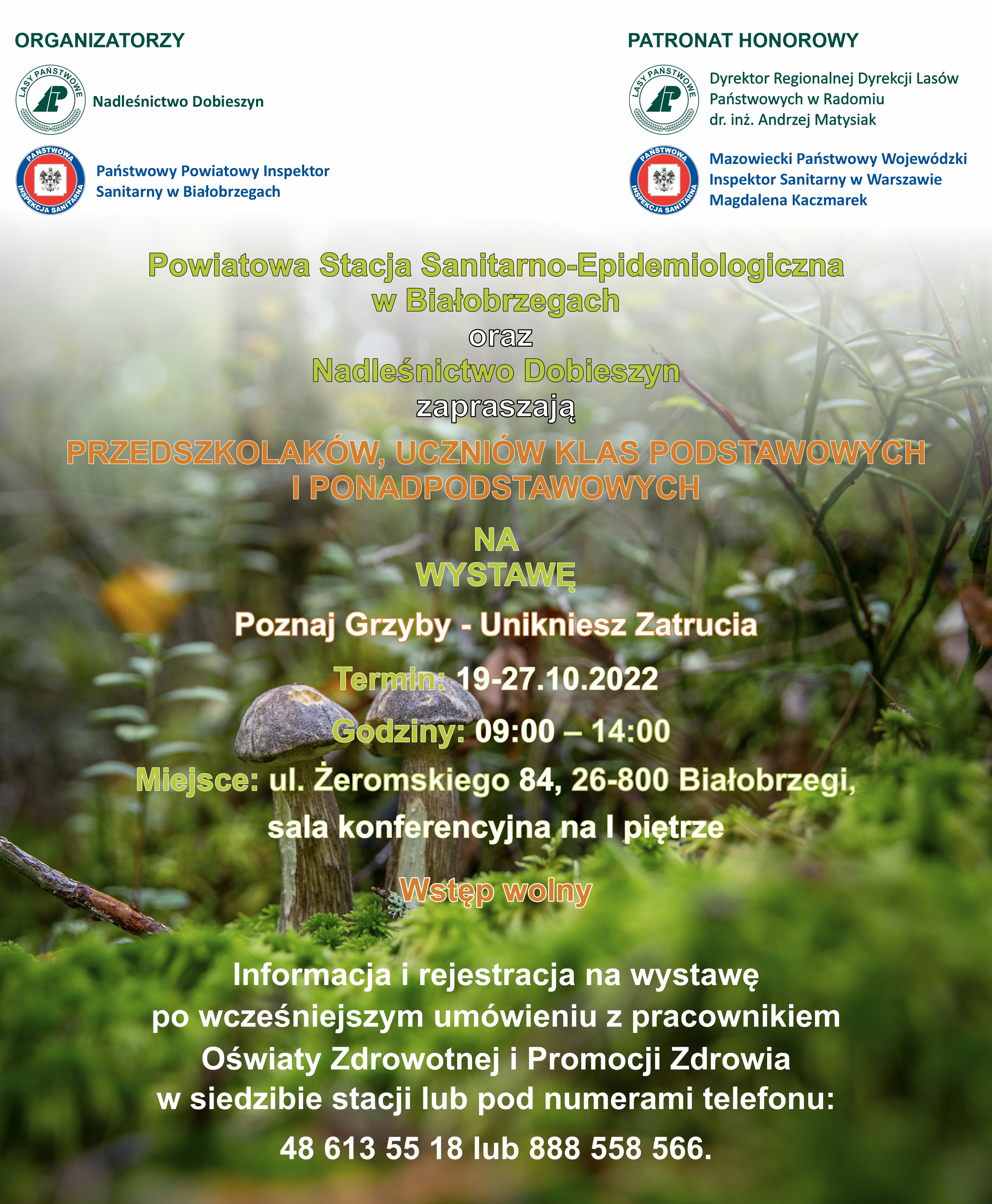 Wystawa jest otwarta dla zorganizowanych grup do 27 października w godzinach 9-14, po wcześniejszym po wcześniejszym umówieniu z pracownikiem Pionu Oświaty Zdrowotnej i Promocji Zdrowia w siedzibie stacji lub pod numerami telefonu 48 613 55 18 lub 888 558 566. Wystawę można odwiedzić w sali konferencyjnej w budynku filii Starostwa Powiatowego przy ul. Żeromskiego 84 w Białobrzegach. Bardzo serdecznie dziękujemy Panu Sylwestrowi Korgulowi Staroście Powiatu Białobrzeskiego za udostępnienie sali na potrzeby organizacji wystawy. W trakcie wystawy będziemy przeprowadzać prelekcje na temat bezpiecznego grzybobrania.