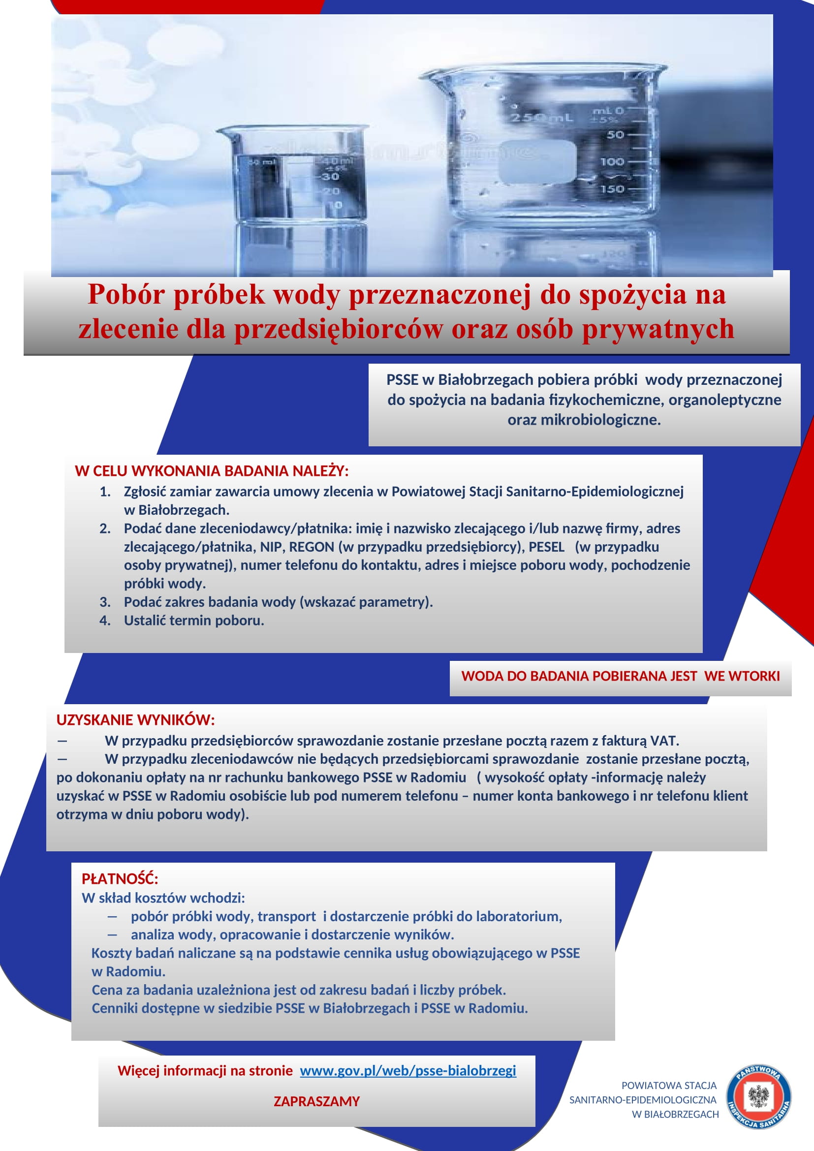 Próbki wody do badania laboratoryjnego pobierane są przez upoważnionych i przeszkolonych próbkobiorców PSSE w Białobrzegach, wyłącznie we wtorki. Pobór wody odbywa się w obecności zleceniodawcy lub osoby przez niego upoważnionej.