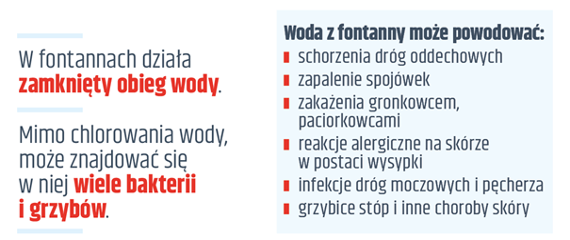 Epidemiolodzy ostrzegają, że fontannach, które mają obieg zamknięty, może znajdować się kilkadziesiąt różnych drobnoustrojów, m.in. bakterie gronkowca, salmonelli, pałeczki legionelli, bakterie kałowe np. E.coli, enterokoki. Mogą one powodować:
