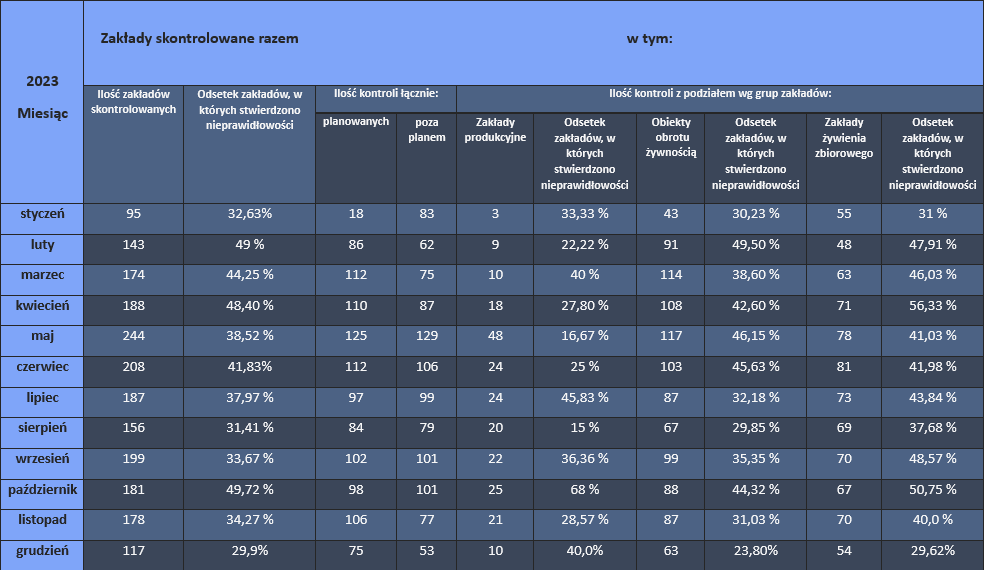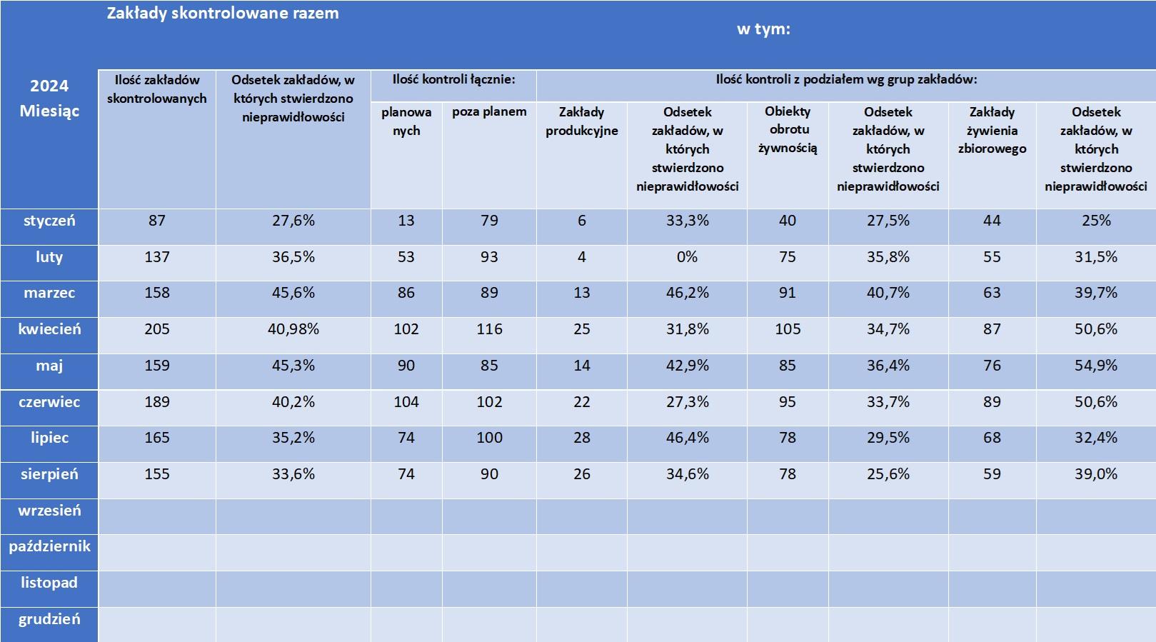 Dane z podjętych czynności kontrolnych przedstawiono w formie tabelarycznej: