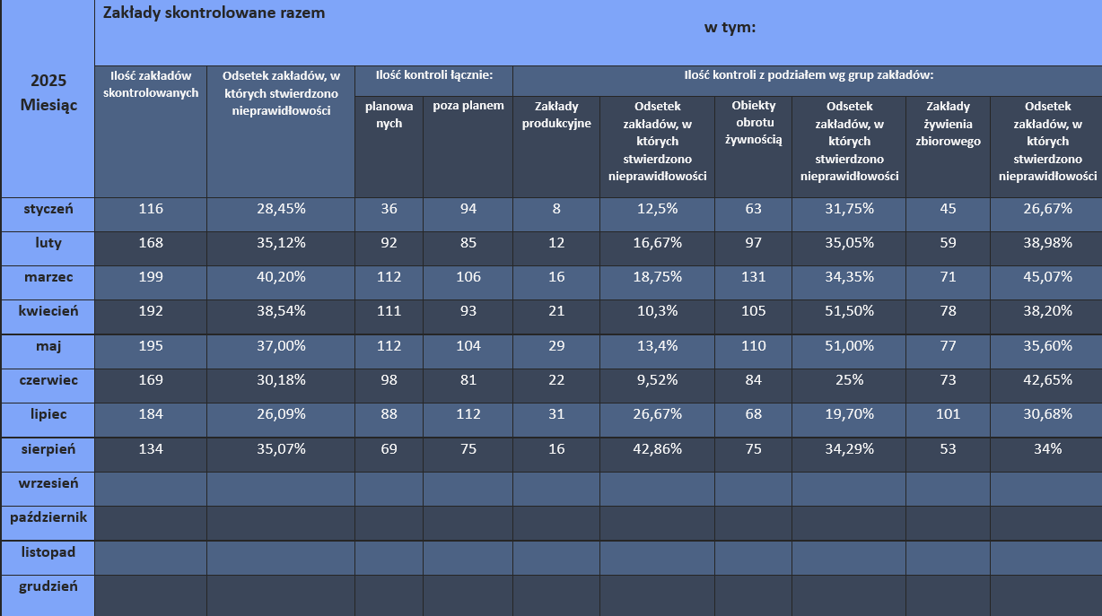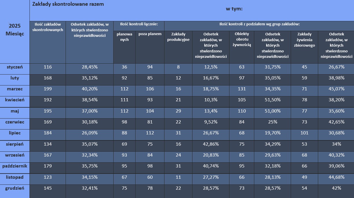 Dane z podjętych czynności kontrolnych przedstawiono w formie tabelarycznej: