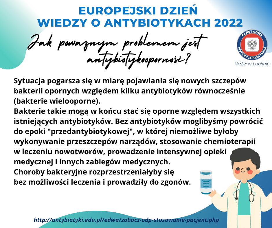 W Dniu 18 listopada 2022 roku w całej Europie obchodzony będzie Europejski Dzień Wiedzy o Antybiotykach (EDWA) oraz w dniach 18-24 listopada 2022 roku Światowy Tydzień Wiedzy o Antybiotykach.