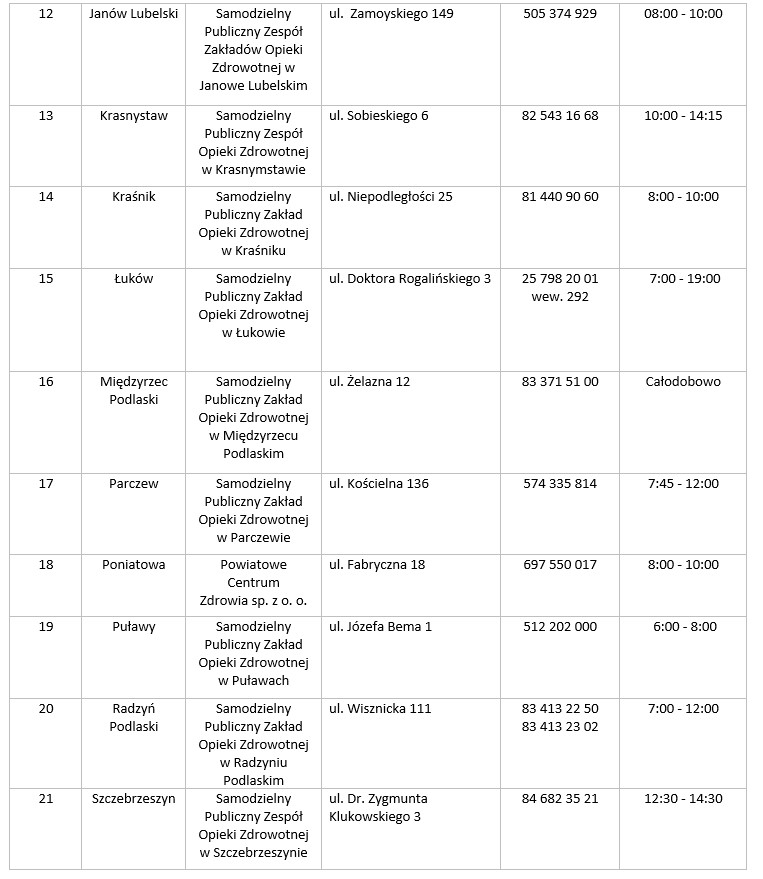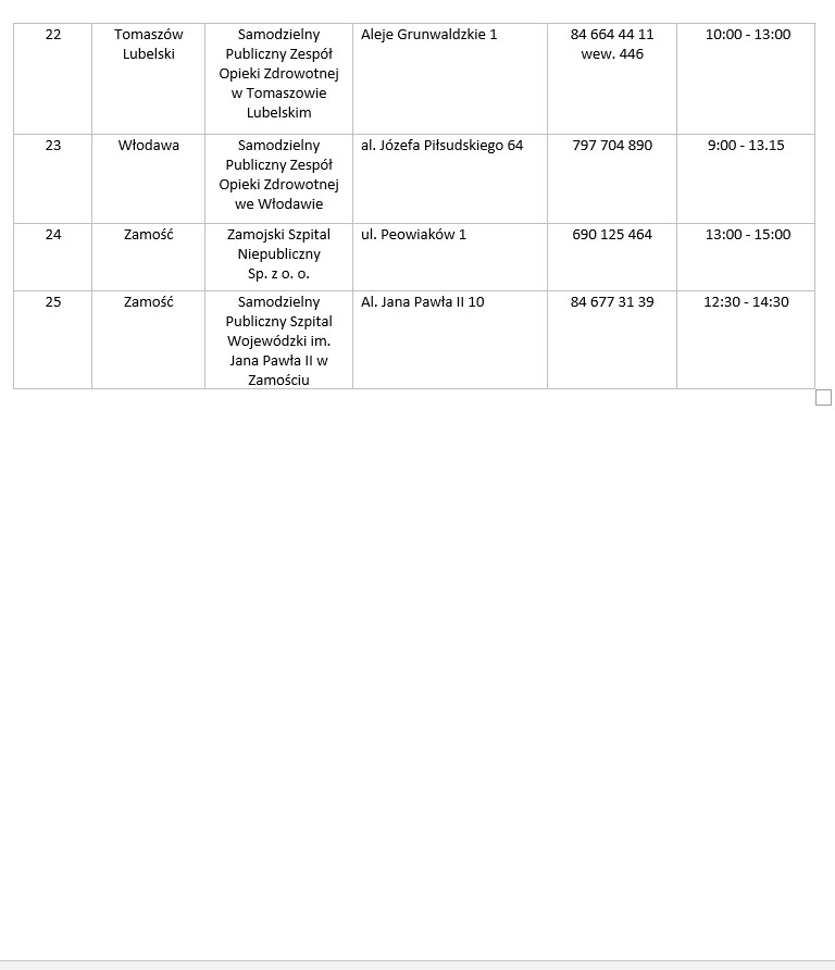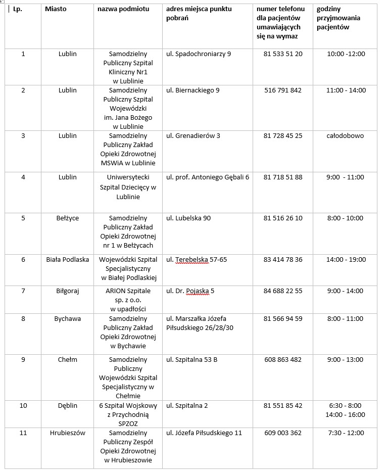 W załączeniu zamieszczamy aktualna listę punktów pobrań badań na SARS-CoV-2 dla województwa lubelskiego na dzień 19.09.2020r.