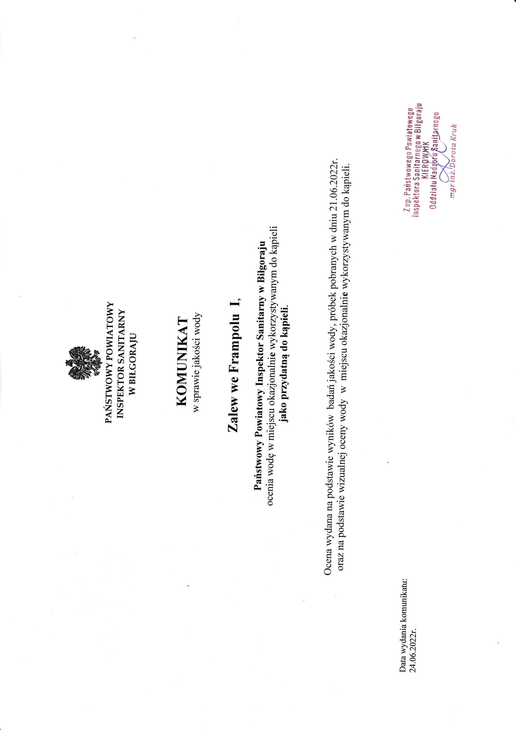 Państwowy Powiatowy Inspektor Sanitarny w Biłgoraju przedstawia w załączeniu konumikat w sprawie jakości wody w zalewe we Frampolu I.