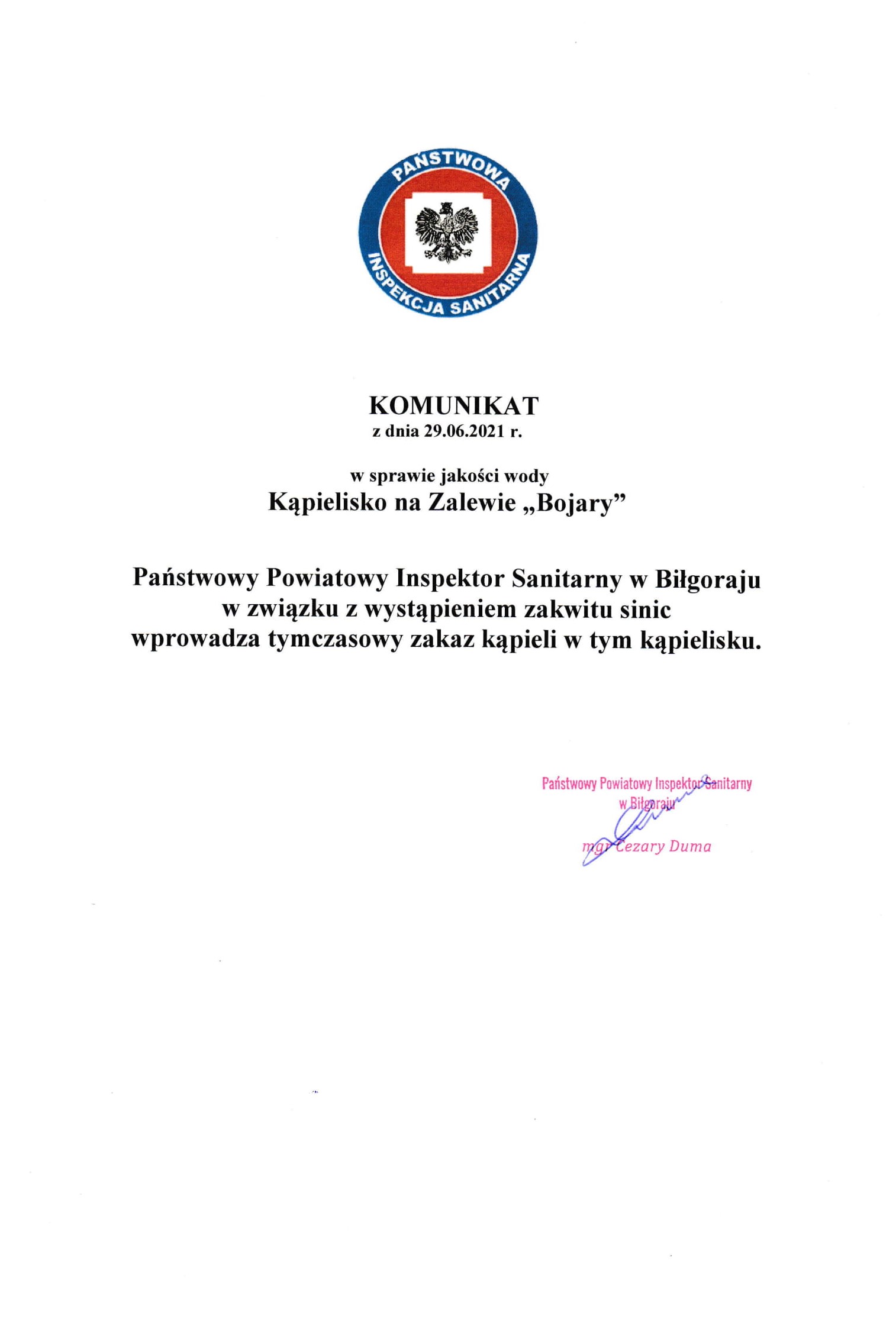 Komunikat o jakości wody Kąpielisko Bojary (2021-06-29)
